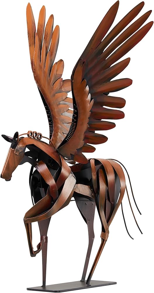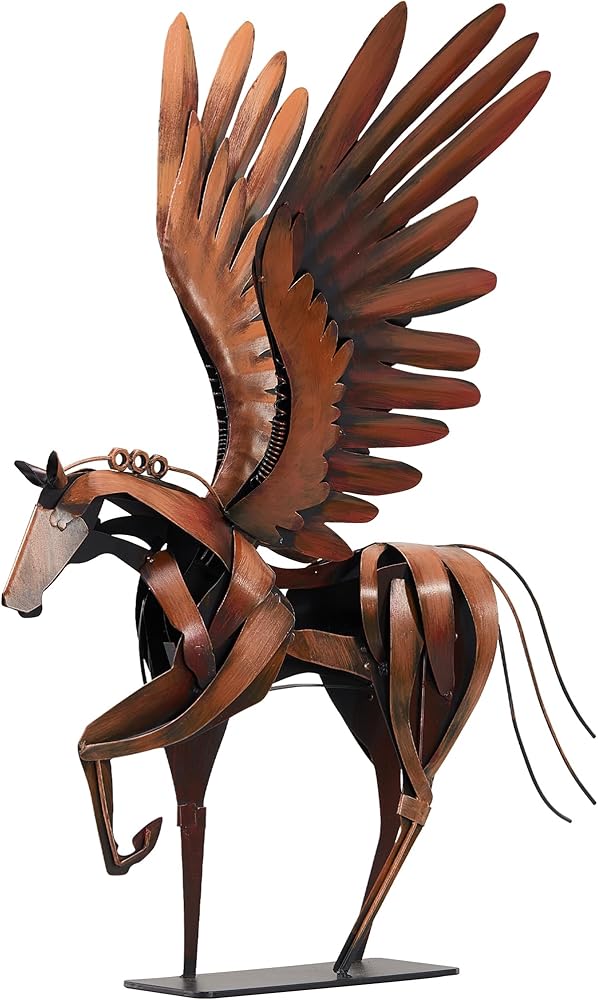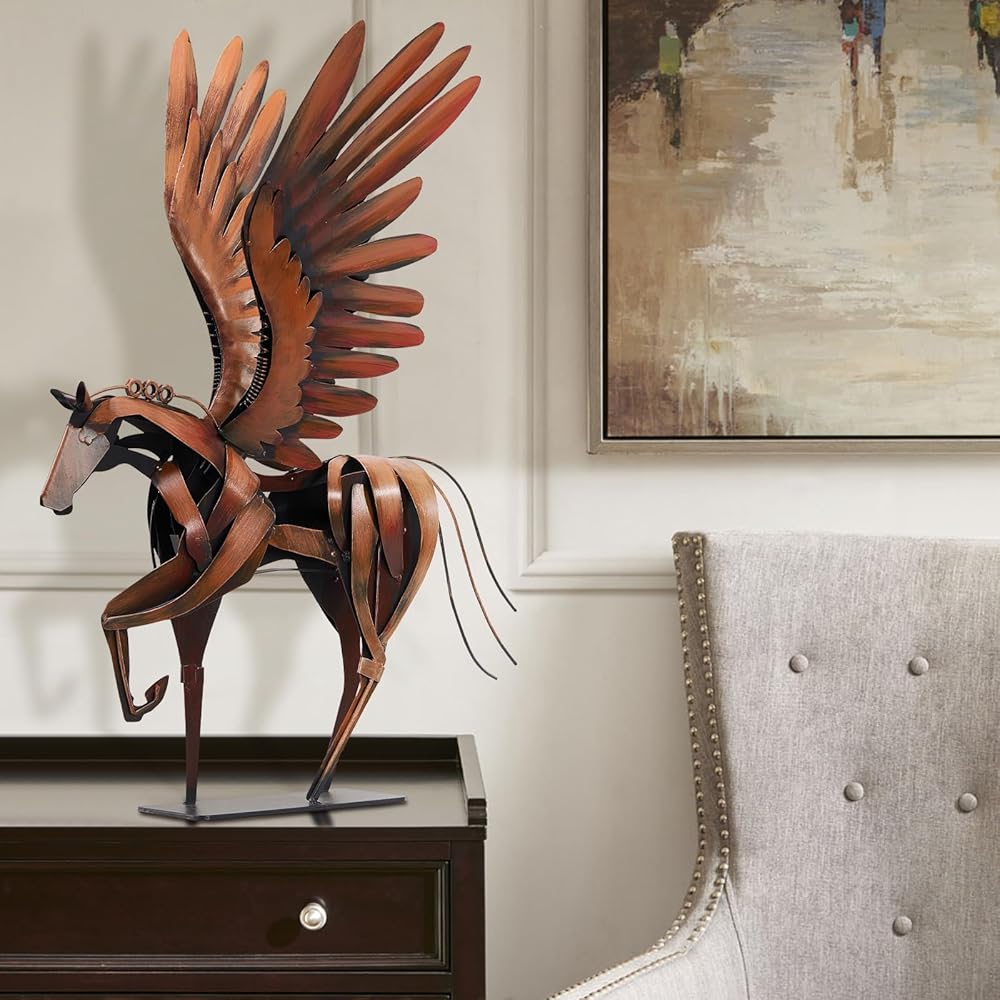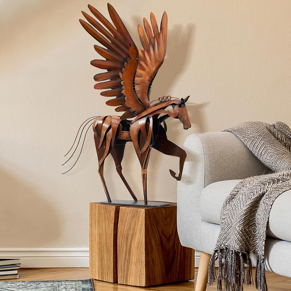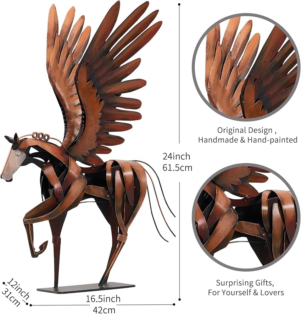 Horse Statue Décor Artwork, 24" H Handmade Metal Pegasus Greek Flying Horse Sculpture, Hand-Painted Animal Figurines for Home Living Room Office (Brown with Wings)