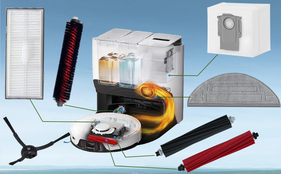 【All You Need Is in One Set 】The S8 Pro Ultra Set includes 2 Roller Brush, 1 Self-Cleaning Brush, 4 Hepa Filter, 4 Side Brush, 4 Mop Cloths, 4 Dust Bags, and 2 cleaning tools, solving your troubles with frequently buy filters or other replacement parts.