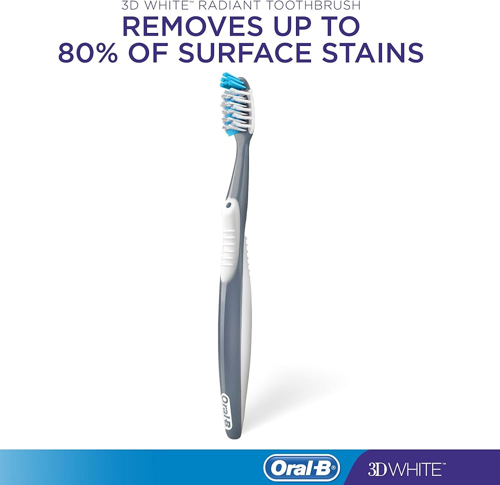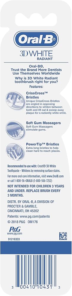 The Oral-B Radiant Whitening Manual Toothbrush whitens between teeth by removing surface stains. It features unique CrissCross Bristles that are angled to reach between teeth to lift out & sweep away plaque and whiten by removing stains. The extra length of the PowerTip Bristles helps to clean those hard-to-reach places. Gentle enough for everyday use, the Soft Gum Massagers provide you with the comfortable clean you need to keep your smile feeling clean and looking radiant.