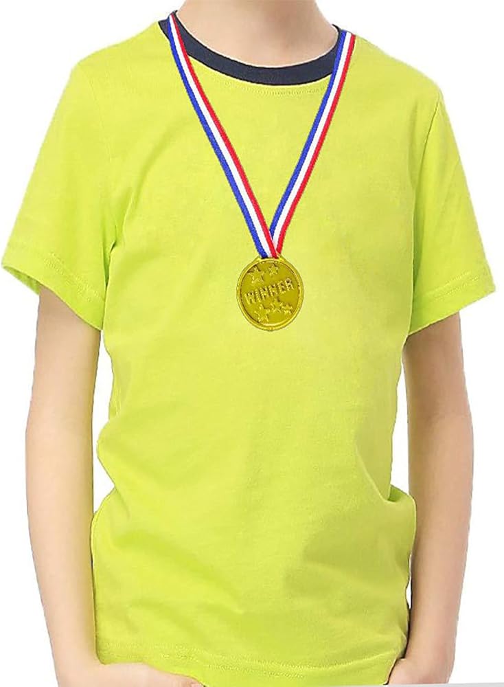 Received List: Each pack contains 24 gold medals for kids, each ribbon length about 11.02 inches/28 cm diameter about 1.38 inches/3.5 cm