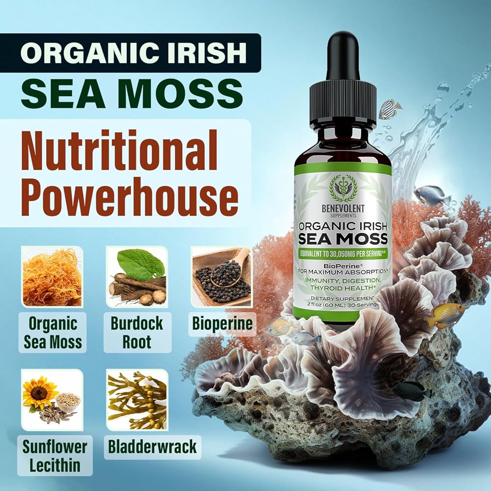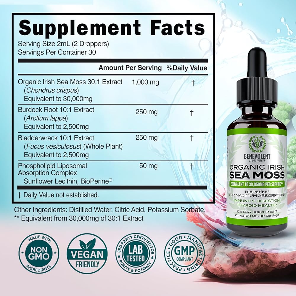Highest Concentrated Form: Experience the purity and efficacy of our sublingual drops designed to effortlessly enhance your daily vitamin routine. Our supplement contains a highly potent 30,000 mg of organic sea moss, fortified with powerful antioxidants from Burdock Root, Bladderwrack to support many body functions, and Bioperine for maximum absorption.