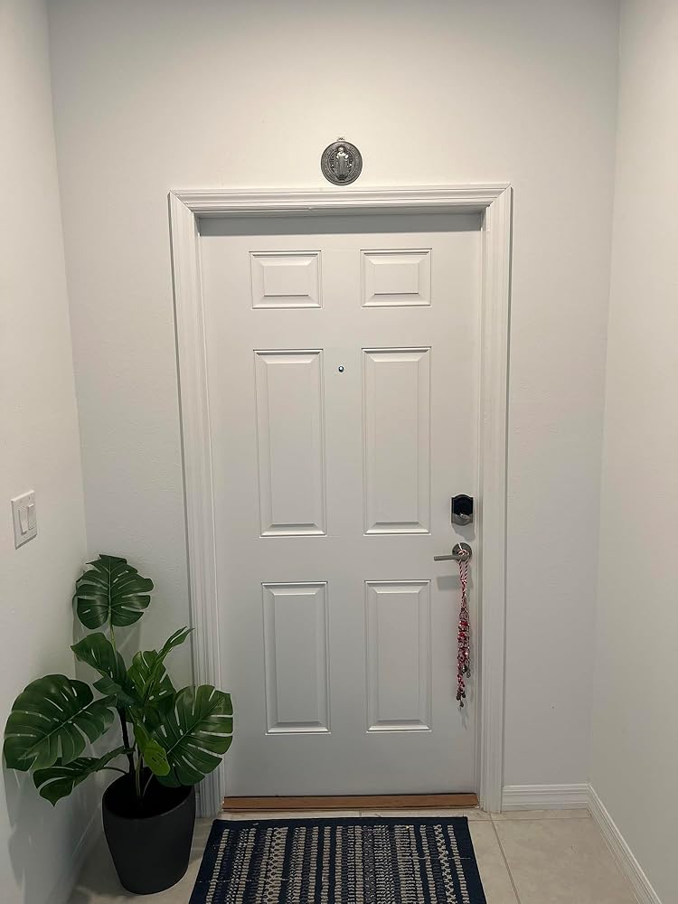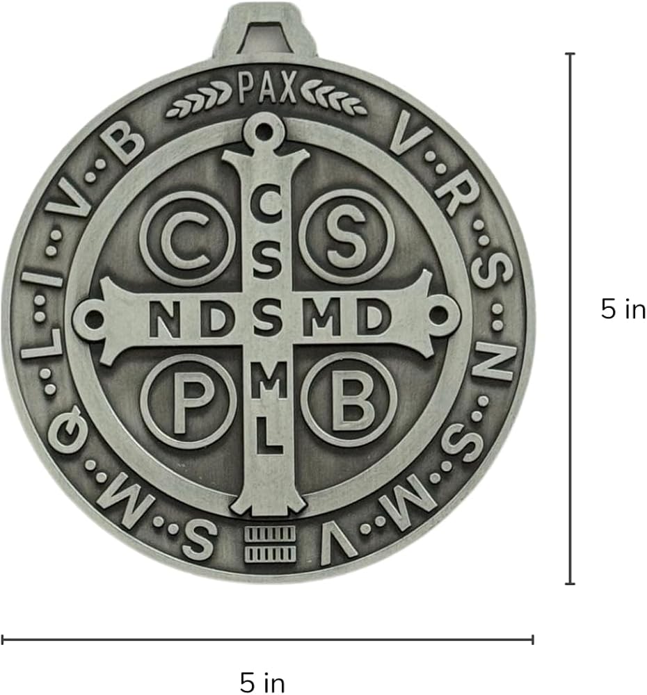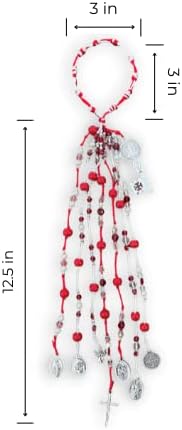 The Door Blessing/Door Protection has ten knots around the hanger, which stands for one decade of the rosary. There are a total of 7 hanging strings that contain charms added specifically for protection that feature images of Jesus, several Saints, and the Guardian Angel. Although it is specifically made to suit most doorknobs, you can hang it wherever you like. The complimentary extra large Saint Benedict metal medal 5 inch diameter is a Christian Symbol of opening doors and opening difficult paths. For this reason, it is typically hung above the main doorframe.