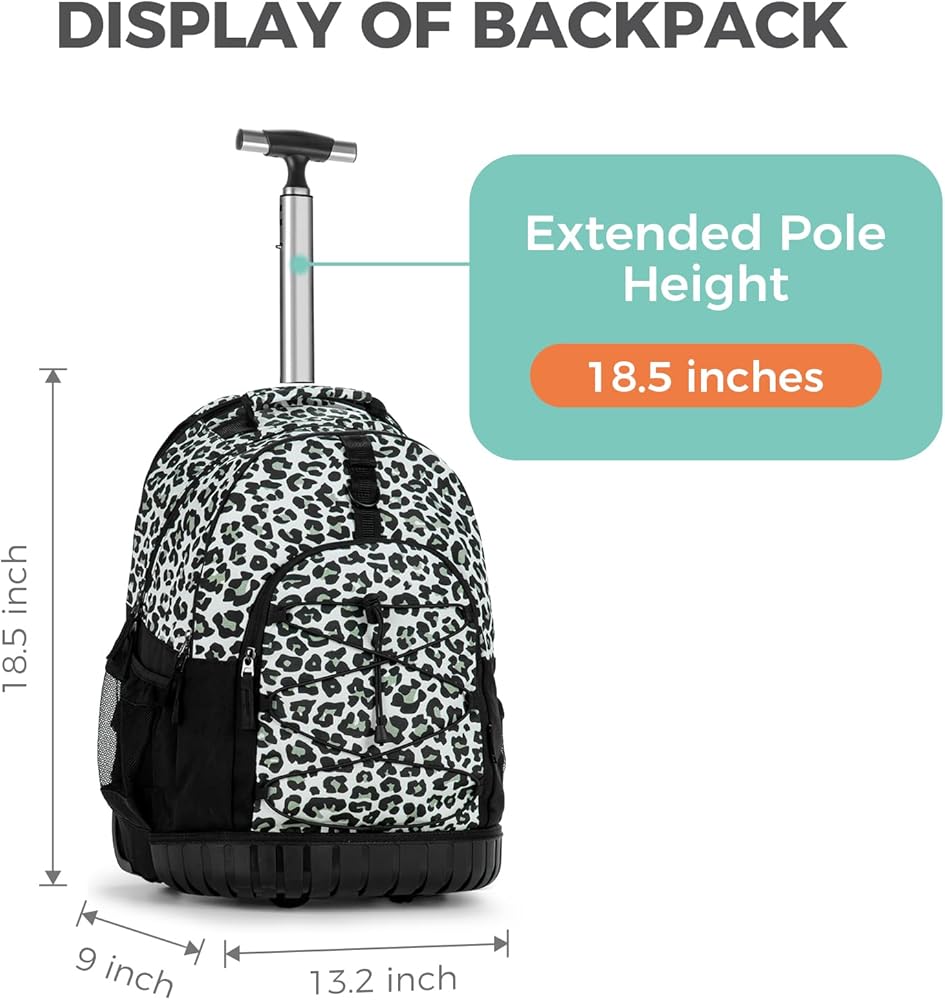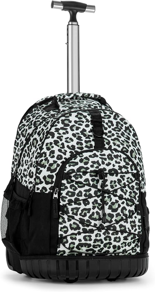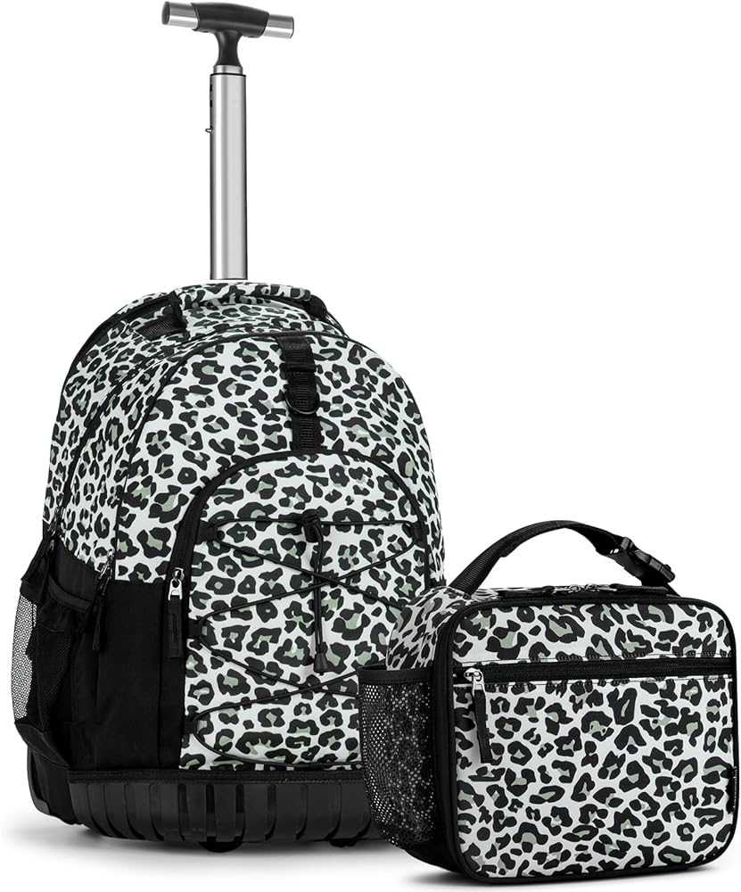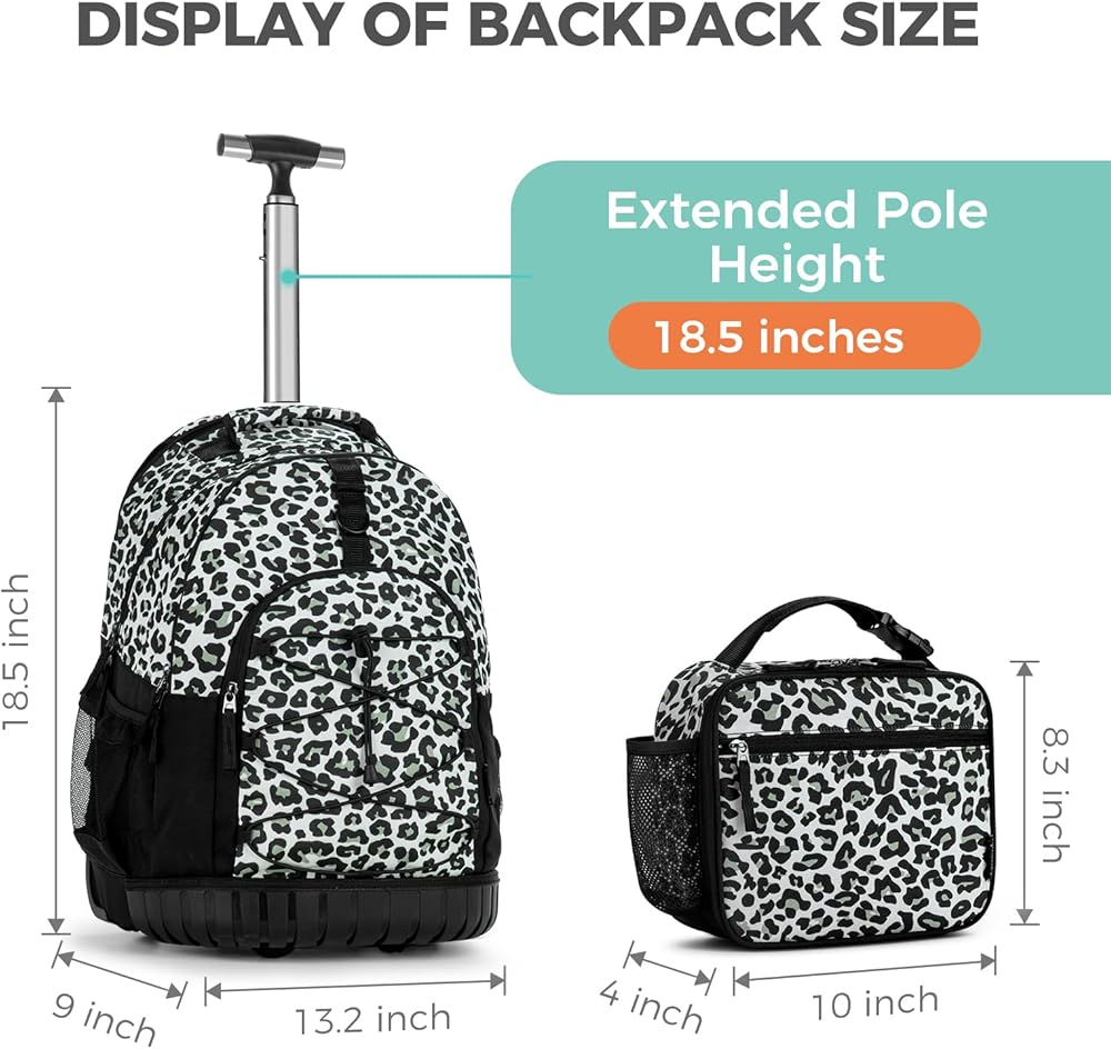 Choco Mocha Rolling Backpack for Girls, 18 Inch Roller Backpack for Middle School Bookbag with Wheels for Teen Girl, Leopard Rolling Backpacks for Girls 8-12 with Lunch Bag Set, Black