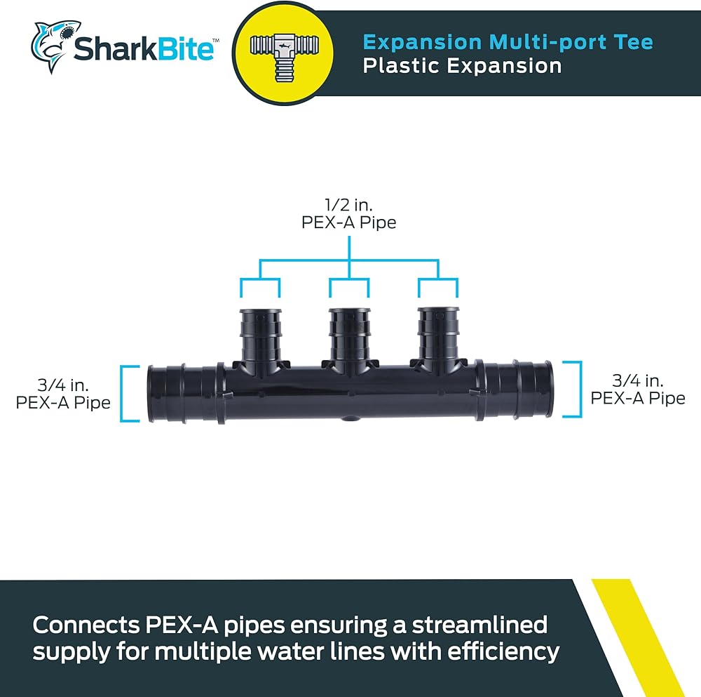 SharkBite expansion multi-port tee is designed to work seamlessly with PEX-A hoses and PEX-A fittings, ensuring a secure and leak-free connection. Whether you're installing a new system or upgrading an existing one, this PEX manifold is an excellent choice. It features a 3/4 inch inlet and 1/2 inch outlets, providing optimal flow control for your water supply. Cross-linked polyethylene, piping is more unyielding to burst pressure, reliable in freezing temperatures, and requires fewer joints due to its superior flexibility. Expansion fittings, especially those used with PEX pipes, are designed to have a smooth interior surface. This design minimizes turbulence and friction to allow full water flow. PEX-A plumbing systems are suitable for pro plumbers and DIY enthusiasts undertaking home improvement projects. SharkBite expansion rings fit snugly over the PEX pipe, providing a strong and durable seal that withstands high water pressure and temperature fluctuations ensuring a secure and leak-proof connection for your PEX pipes. SharkBite Expansion manifolds are compatible with all PEX-A tubing from any manufacturer. Expansion fittings are quick and easy to install. Cut pipe to proper length and slide the expansion ring over the PEX-A hose. Use a manual PEX expansion tool, or a cordless PEX expansion tool to insert and hold fitting in place until the expansion ring and tube contracts tightly. The Interior cross-hatch stops the ring from sliding off the pipe to ensure proper and quick installation; No solder or bonding agents required making your plumbing work quicker, reliable and more efficient.