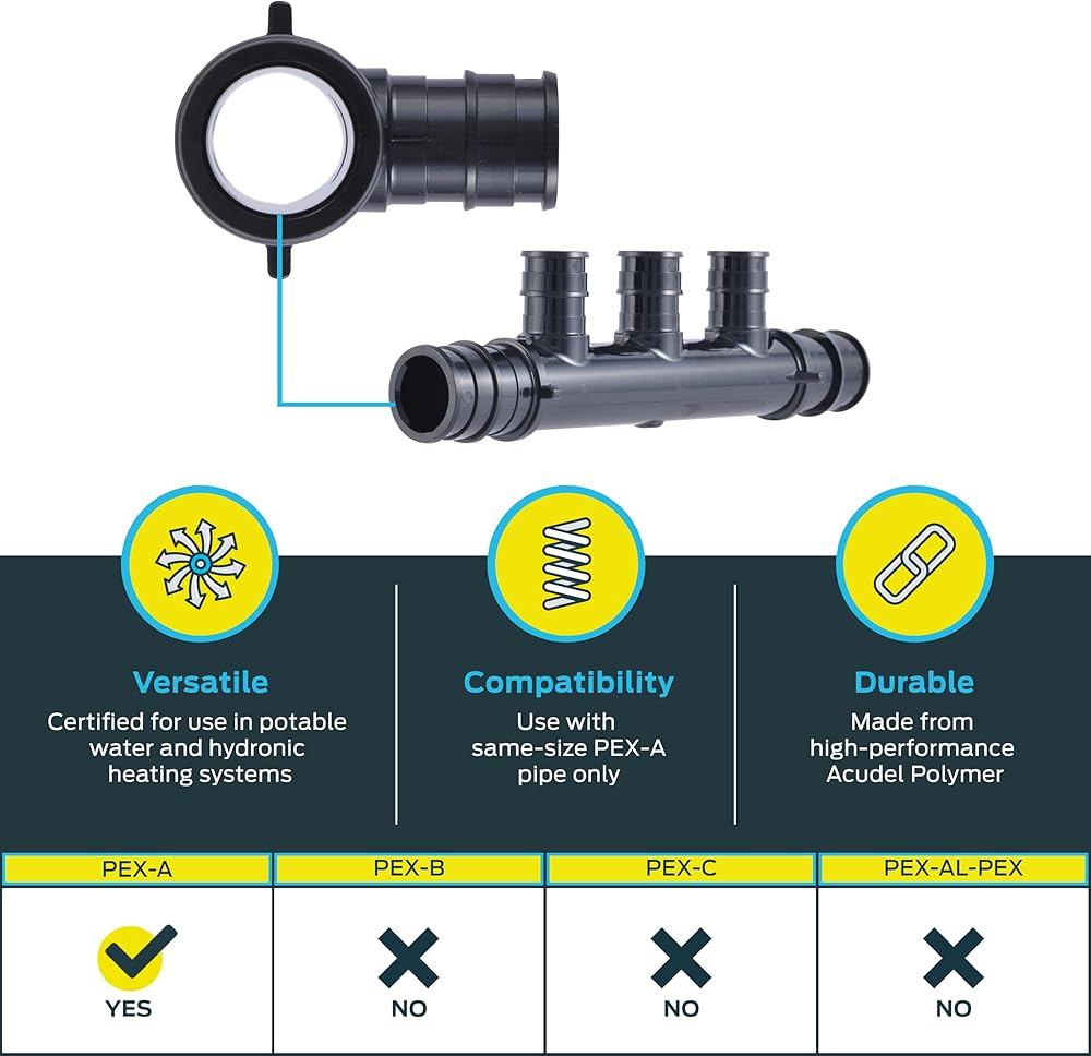 CERTIFIED: This poly multi-port tee meets ASTM F-1960 and ASTM F-877 standards for product safety. Expansion manifolds are compatible with all PEX-A tubing of the same size from any manufacturer.