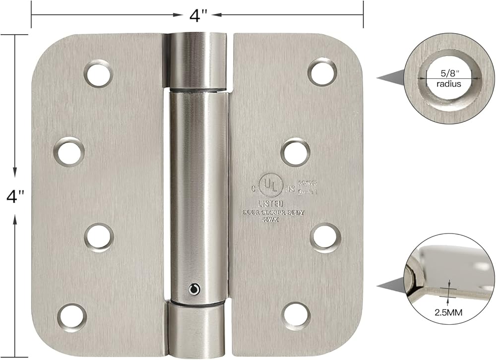 Specification: Full Mortise Adjustable Spring Hinge 5/8" Radius(3.5"X3.5"X2.2 mm).UL Listed.