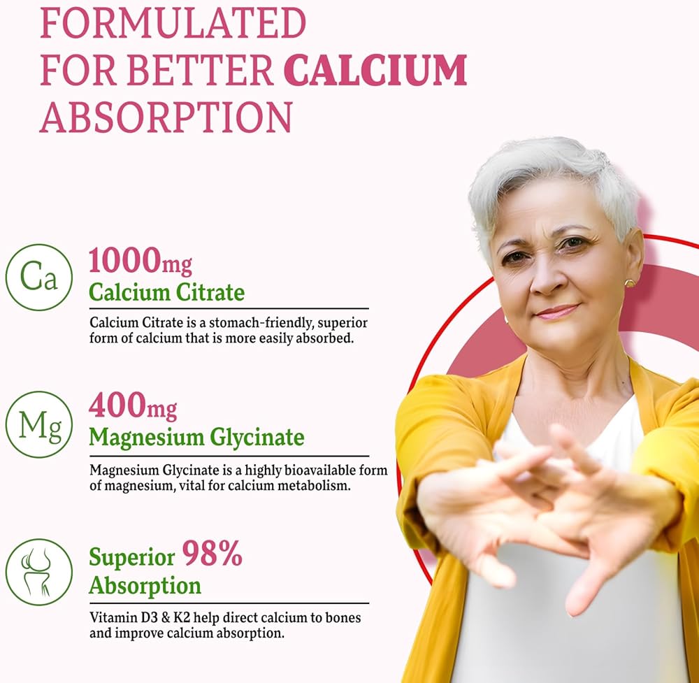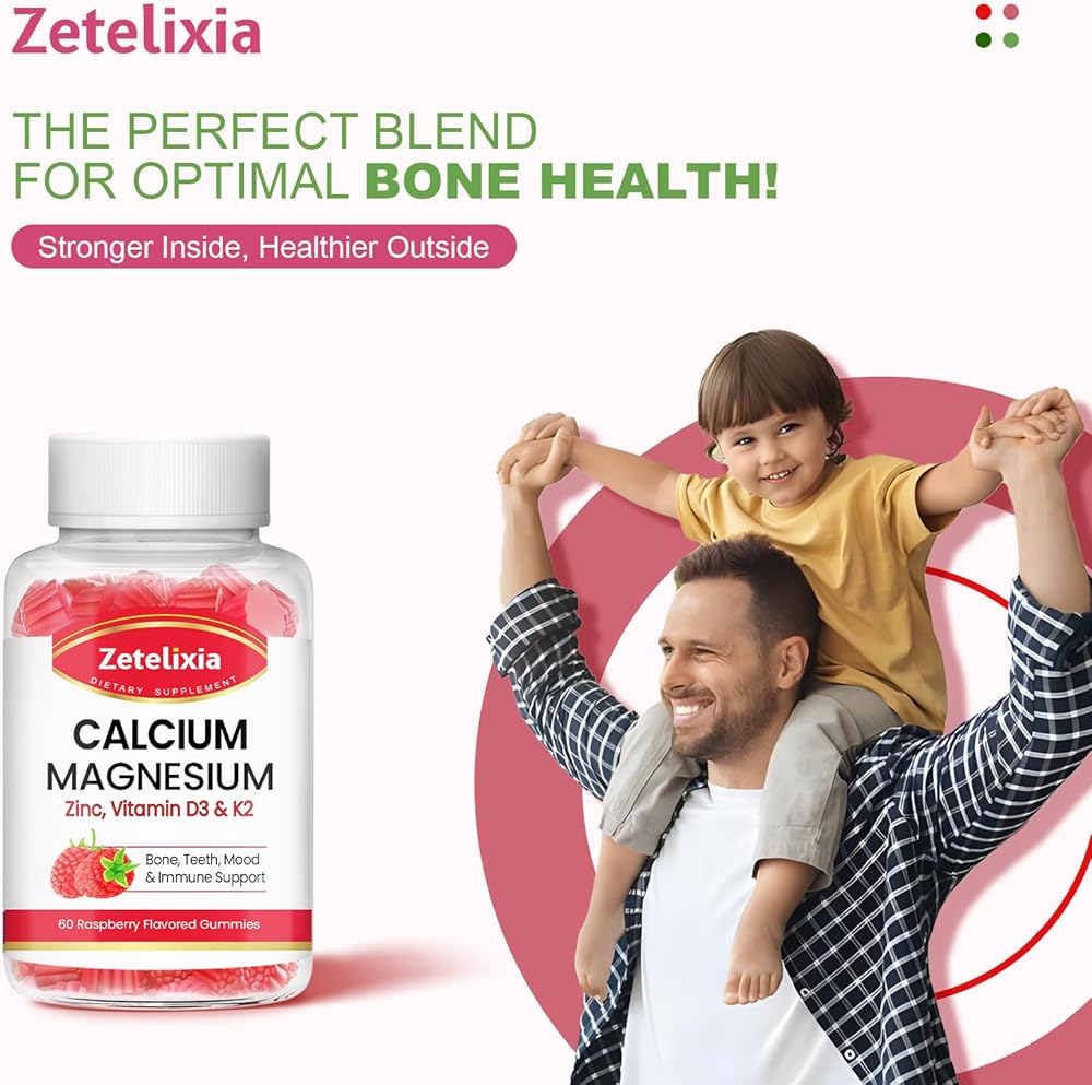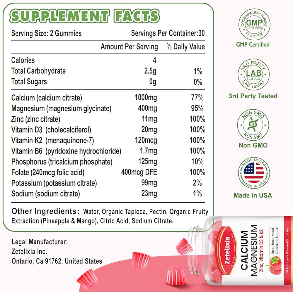 Quality Formula for Maximum Potency: Each serving of our calcium magnesium gummies packs 1000 mg of calcium citrate, 400 mg of Magnesium Glycinate, 11 mg of zinc combined with vitamin d3, k2, Phosphorus, Folate, Potassium, Vitamin B6 for optimum results