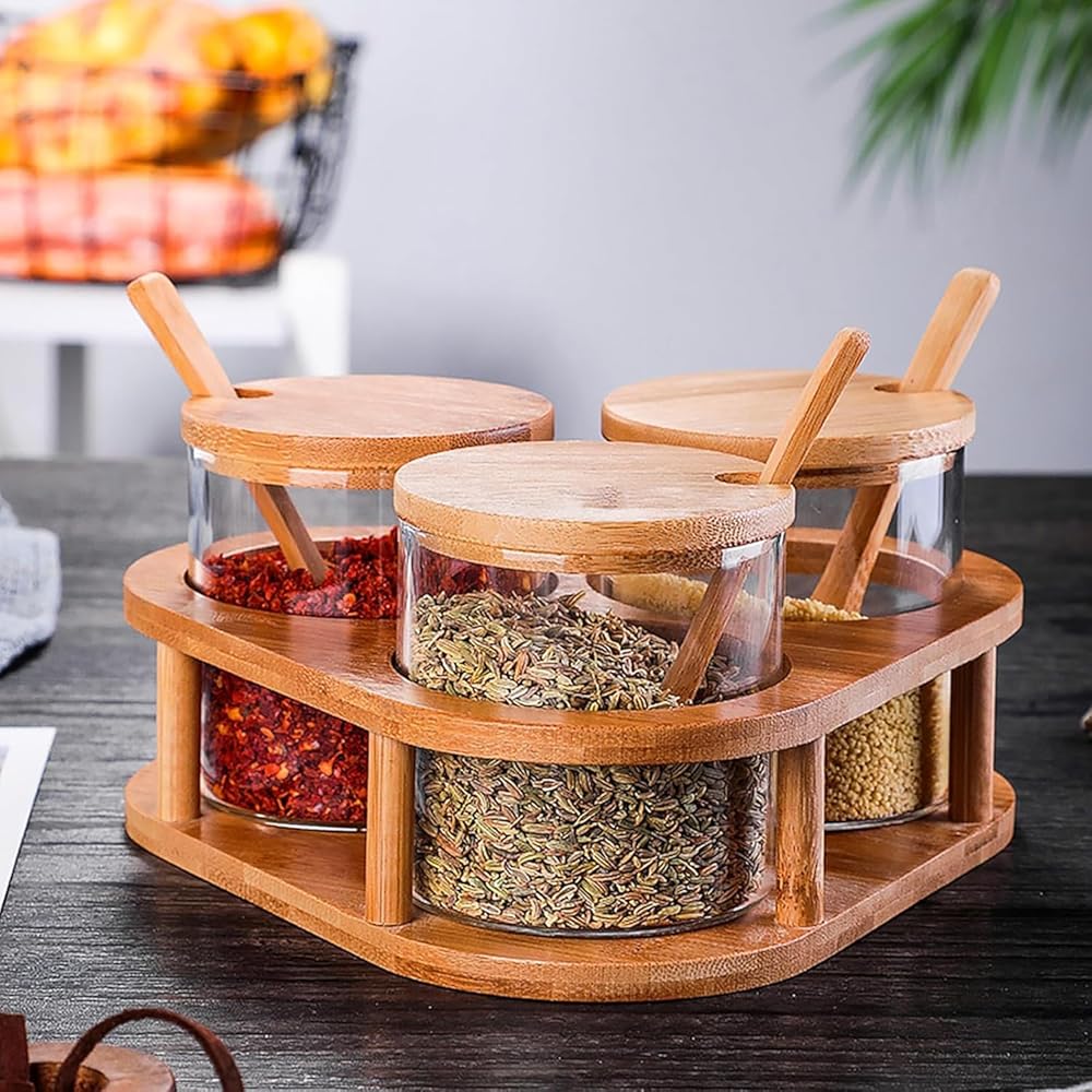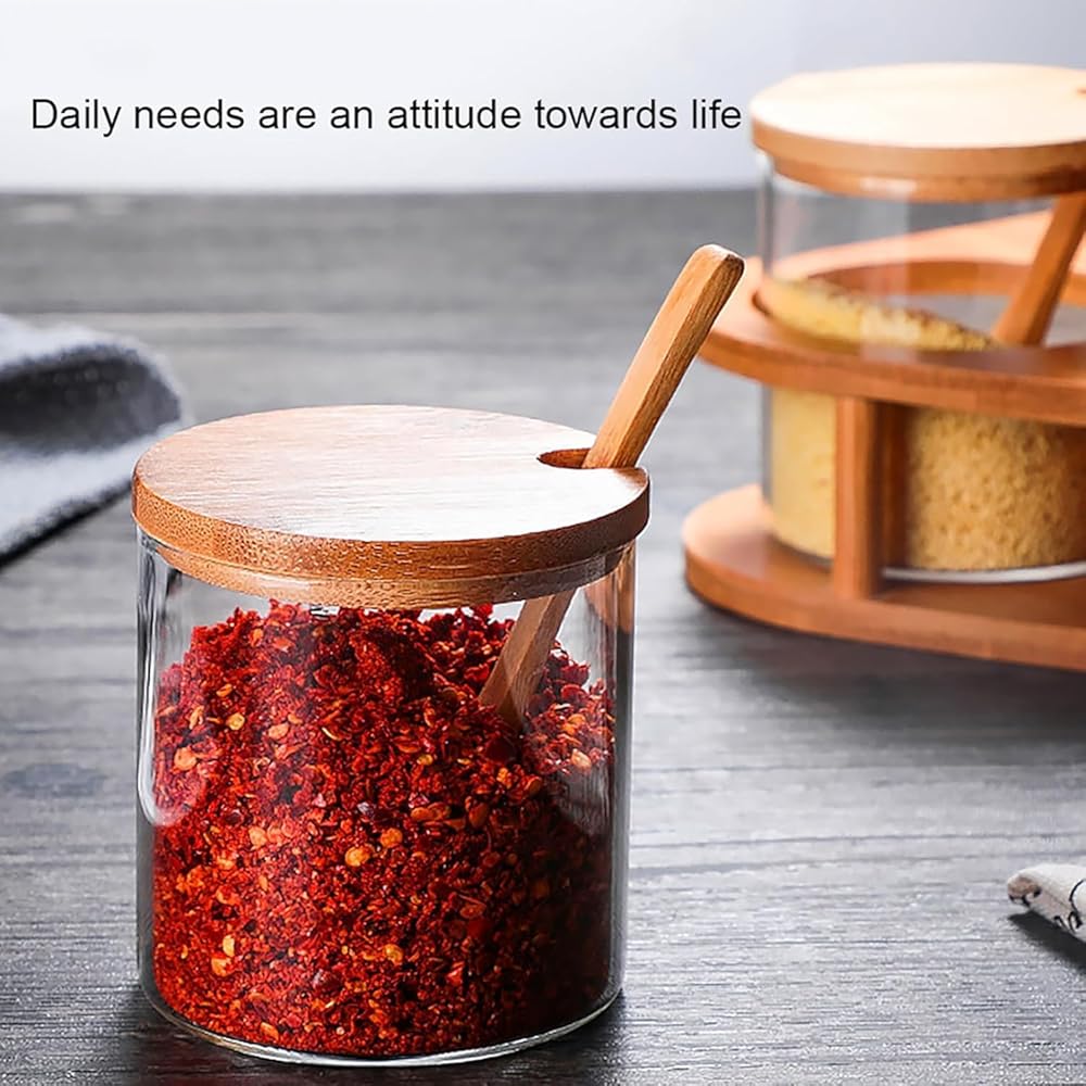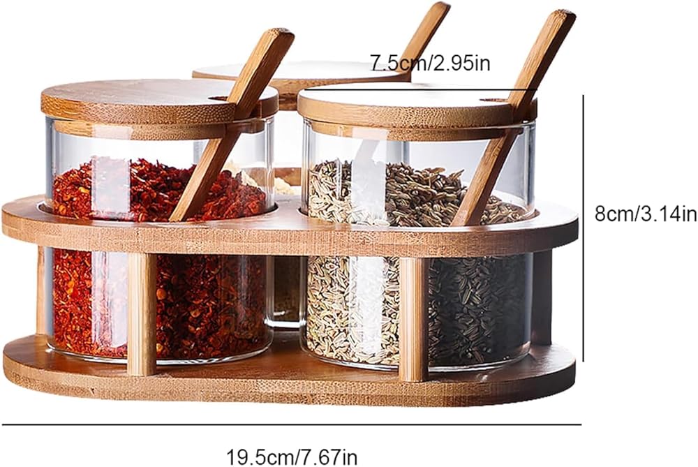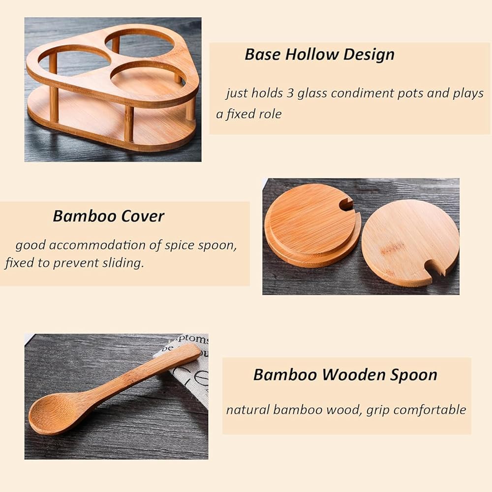 EXQUISITE DETAILS: Features a notch on lid, which can store the spoon so that you can pick and place the right amount of spice at any time. Sturdy bamboo base has 3 non-slip slotted spaces to hold condiment container, keeping kitchen always in tidy.