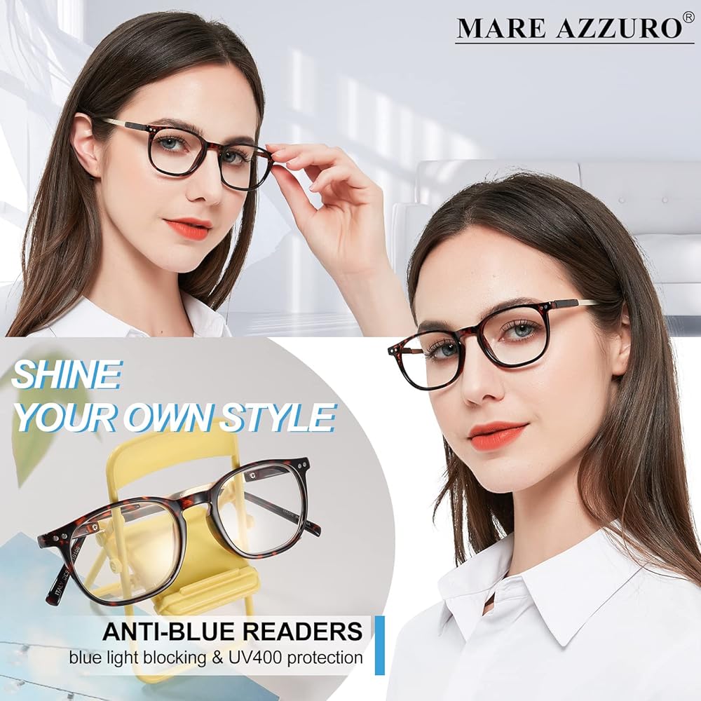 MARE AZZURO blue light blocking reading glasses - has accurate 1.00 1.25 1.50 1.75 2.00 2.25 2.50 2.75 3.00 3.50 4.00 strength to meet your need, cute round style, excellent crafted! Please confirm the size: frame width: 135mm; lens width: 48mm; lens height: 38mm; bridge: 18mm; temple length: 140mm.