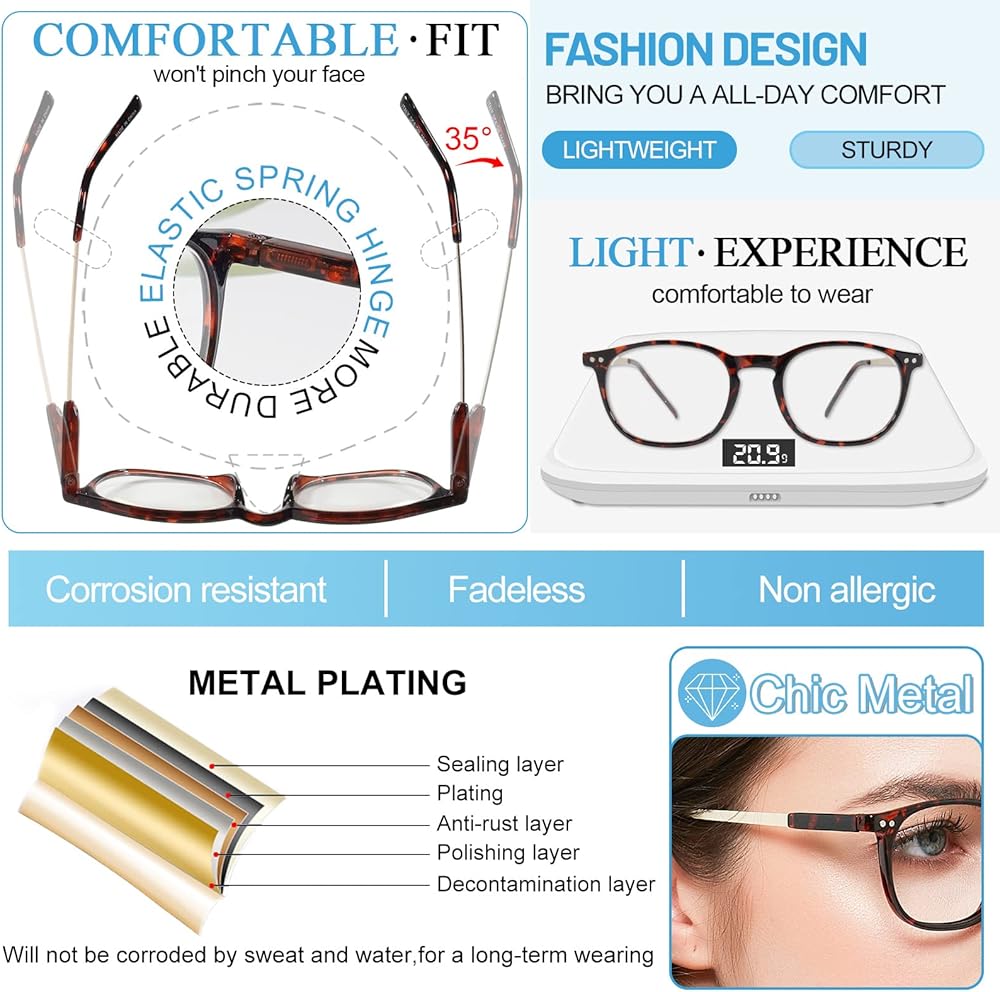 Comfortable fit - designer round readers for women, lightweight frame and bright light color to make a fresh and attractive look. With flexible spring hinge fits well for most faces, won't pinch head. Also non-slip one-piece nose pad, ergonomic temples and a bigger vision without turning neck for a all-day comfort.