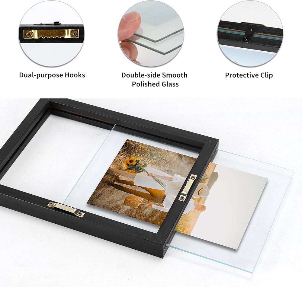 Dimension: Measuring in L:7.64" W, and H:9.65", the 5x7 floating picture frame set of 4 can be hung in either horizontal or vertical orientation on the wall to suit your preference, while the fixed clip ensures secure display.