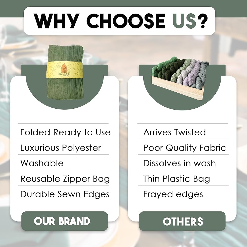 100% Polyester: Our Sage Green cheesecloth table runner is made with 100% polyester which is soft to the touch. The cheese clothes table runner comes folded and ready to use out of the package.