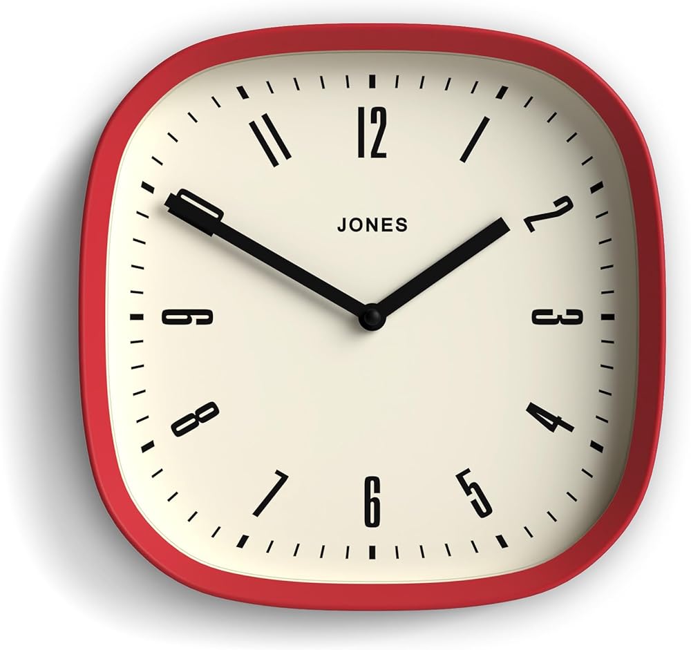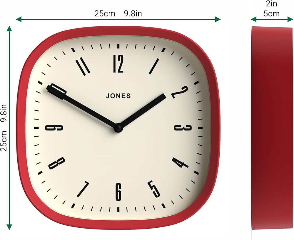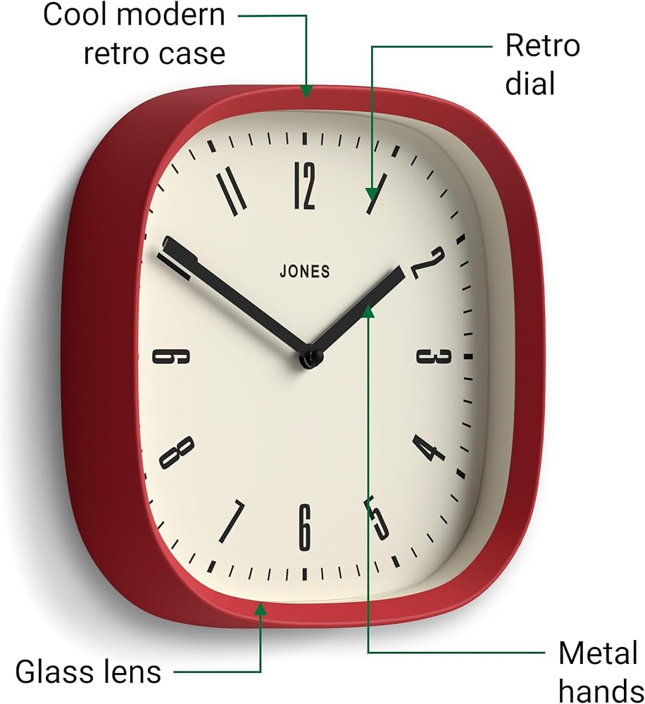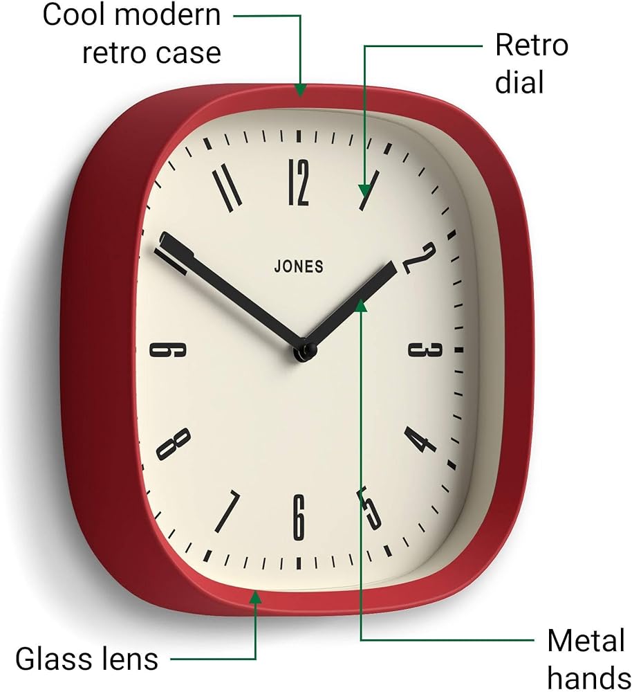 The Marvel from Jones Clocks is a trendy yet retro square clock, the perfect addition to your home accessories. With its high-quality acrylic construction, retro curved edges, glass lens and durable straight metal hands, this wall clock is designed to last and keep you on time. The matte finish exudes a blend of retro and modern aesthetics, fitting seamlessly into your living room, bedroom, or kitchen. Jones Clocks are synonymous with quality and style. With a proud UK history of designing beautiful timepieces, you can be assured of the craftsmanship and durability of the Marvel wall clock.
