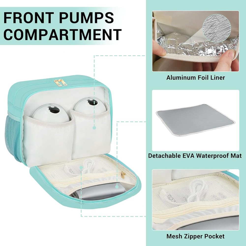 WEARABLE PUMP BAG - The front section with 2 elastic padded pouches compatible with some wearable breast pumps and keep them safe & clean. Mesh zipper pocket can stores breast milk storage bags or charging cables, and a rolled PEAV waterproof mat(unfold) can put up some breast pumps, baby bottles, pump parts so on.