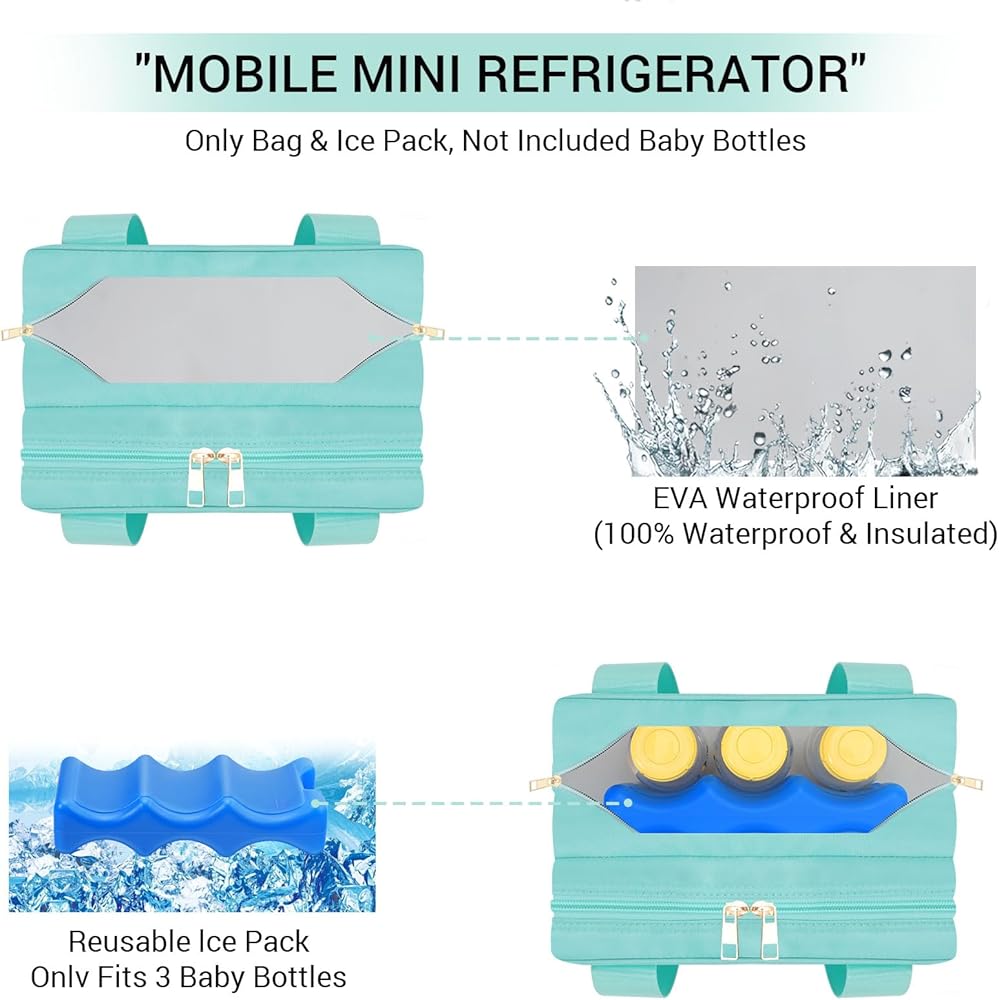 PORTABLE COOLER COMPARTMENT - The cooler room with a full aluminum lining with an ice pack, just like a ”mobile mini -fridge” keeps breast milk fresh for hours. It's a waterproof liner to prevent leakage and fits 3 baby bottles up to 9 ounces or some infant's milk storage bags.