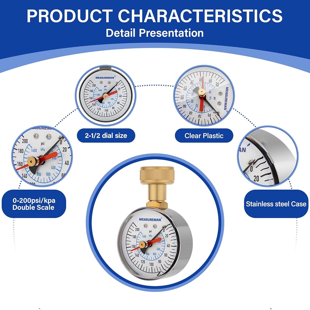 Pressure Range: 0-200 psi/kPa dual scale, suitable for various pressure measurement needs.