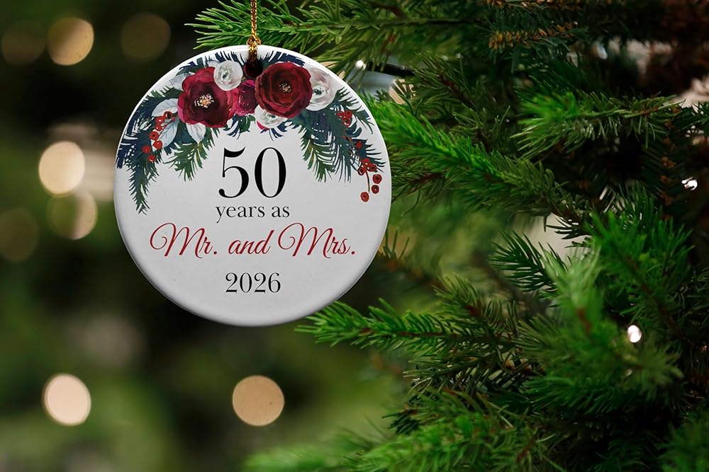 50 Years as Mr. and Mrs. Glossy Ceramic 2.875” round Christmas Ornament. Our designers have created a unique and unforgettable tree ornament that will immediately be a treasured keepsake. This ornament will bring joy to anyone.