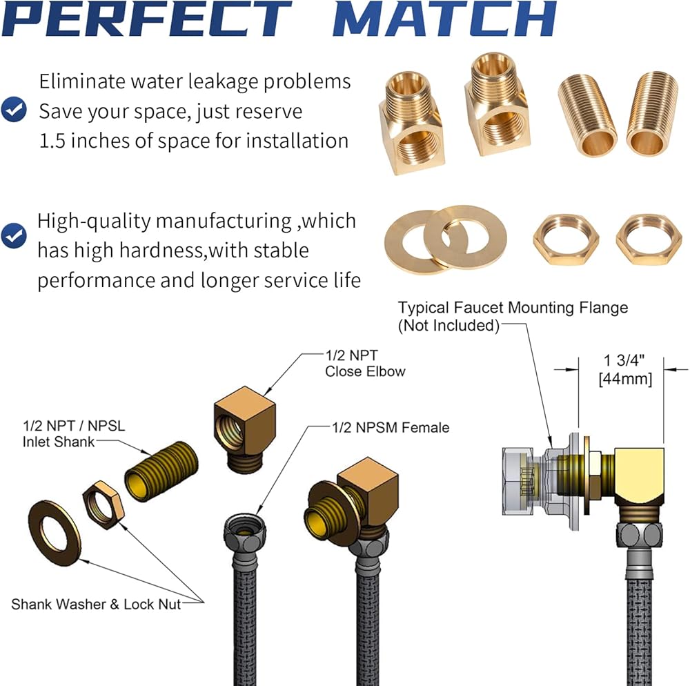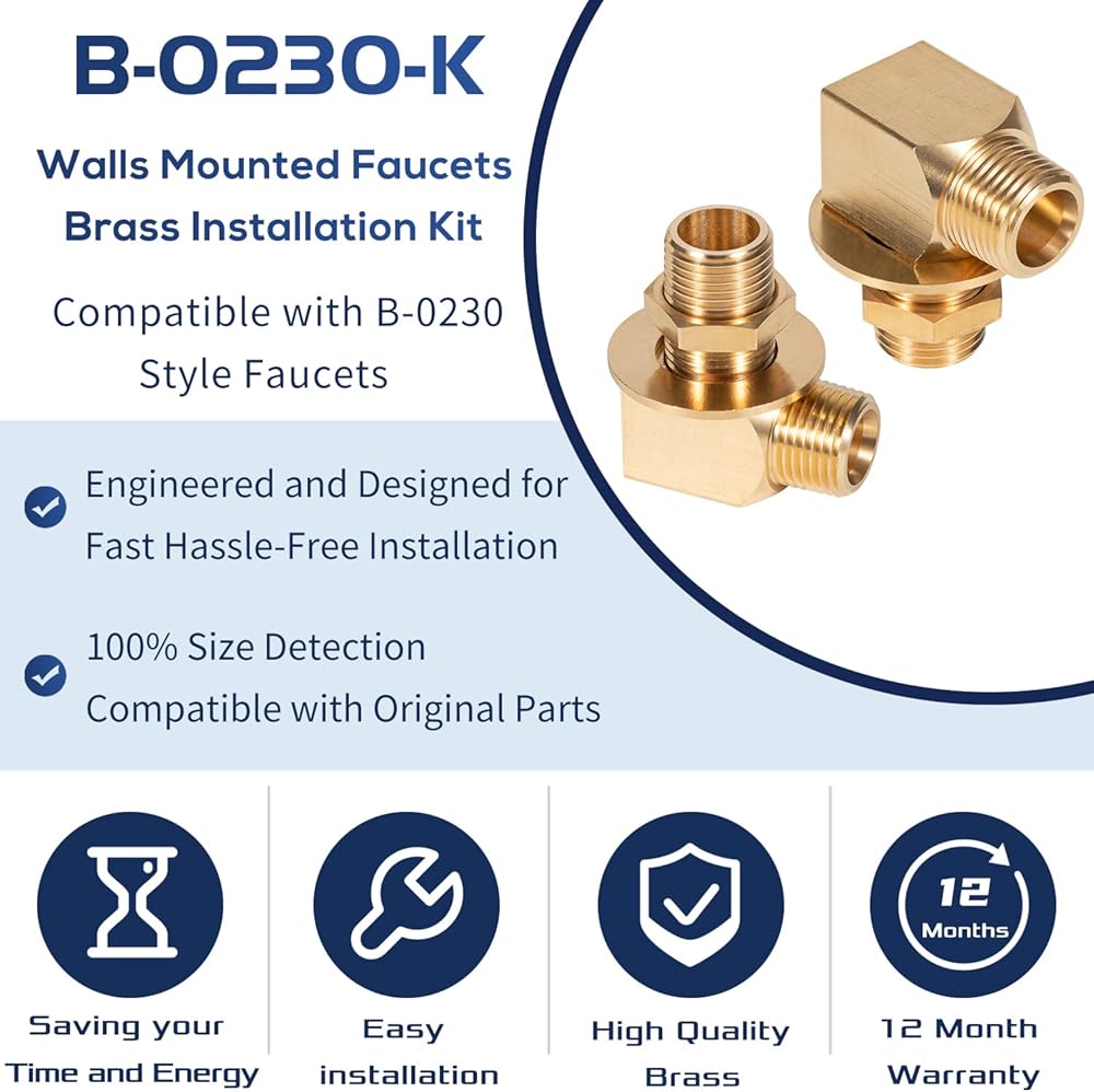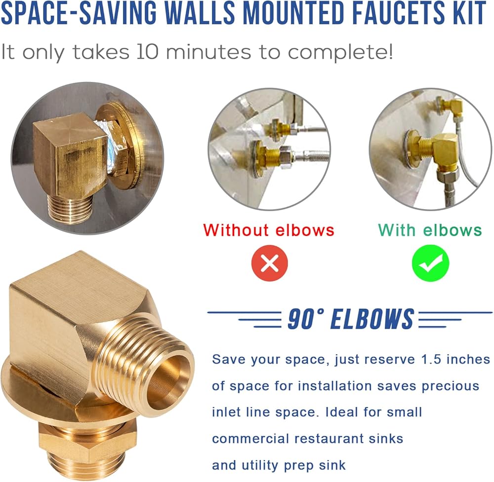 Package Includes: The B-0230-K brass wall-mounted installation kit includes: 2 x 1/2" NPT Nipples, 2 x Lock Nut, 2 x Washer, 2 x Short Elbow 1/2" NPT Female x Male. Comes with all the necessary parts for you to replace it on your own. Suitable for commercial restaurant, kitchen, utility sinks and so on. (Note: Please confirm that connector size before you order)