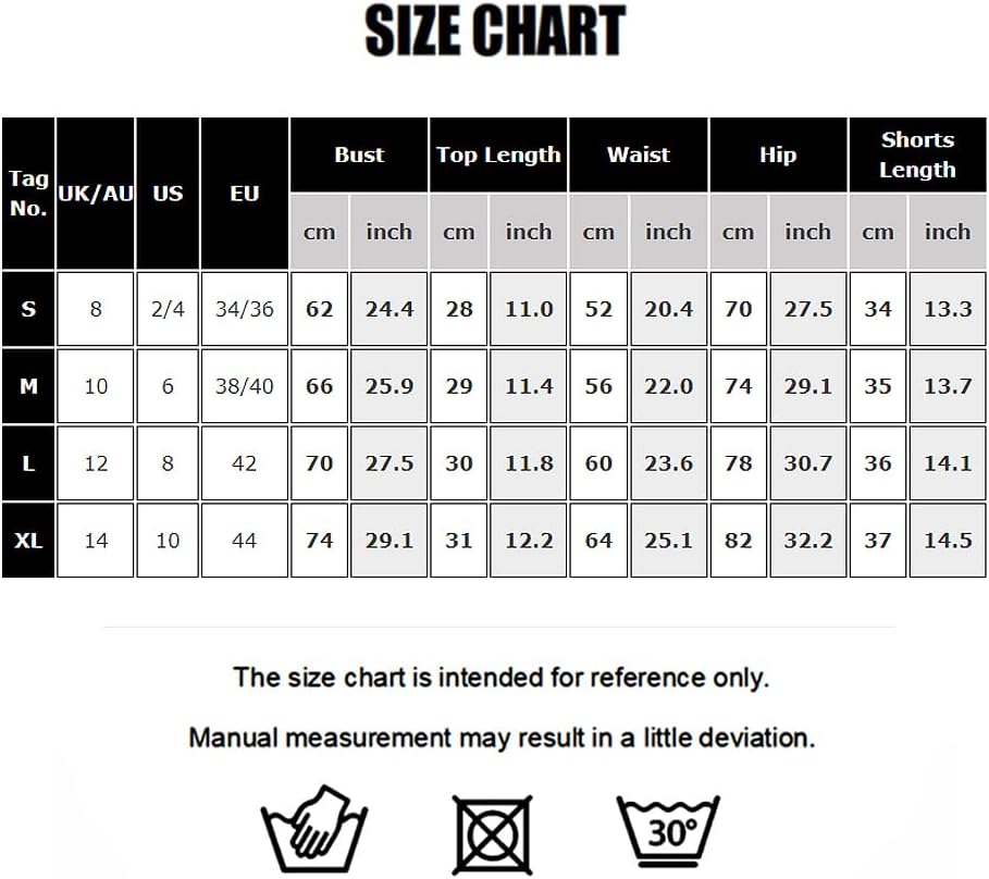 Tag No.S: Bust: 24.4" / 62cm; Top Length: 11.0" / 28cm; Waist: 20.4" / 52cm; Hip: 27.5" / 70cm;Shorts Length: 13.3" / 34cm;