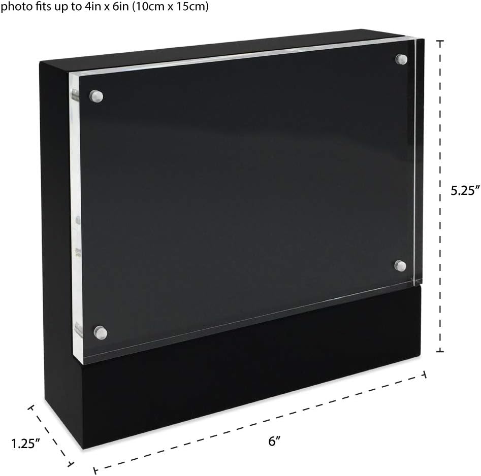 MAGNETIC FRAME: Strong magnets in the four corners of the frame keep your photo firmly secured between the acrylic pane and the attractive wood block base. Switching out the photo you took of the gorgeous view from the Grand Canyon with the must-have shot in front of a Redwood tree can be done in seconds. Whether you want to reflect on a trip or show off your dog's ability to look cute on the couch, the photo or thin keepsake will have a home in this frame.