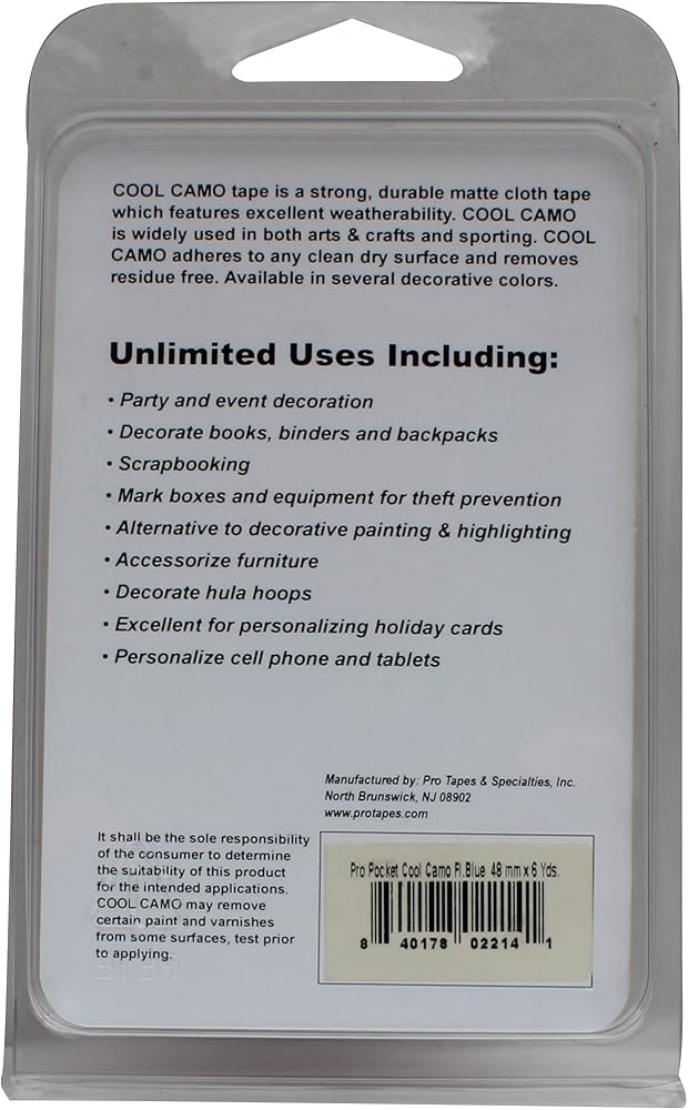 The Pro tapes cool camo tape is 11 mils thick and is made from matte cloth with a natural rubber adhesive to conform to irregular surfaces and remove cleanly without residue from most surfaces. The tape, also known as gaffer or gaffers' tape, is suitable for a range of applications including school Books, supplies and backpacks. Cool camo is great for decorating sporting equipment, hunting equipment and dorm rooms. It resists abrasion and can be torn by hand. The tape can be used outdoors and withstands temperatures from 50 to 200 Degrees F. Tensile strength is 45 lb. Per inch.