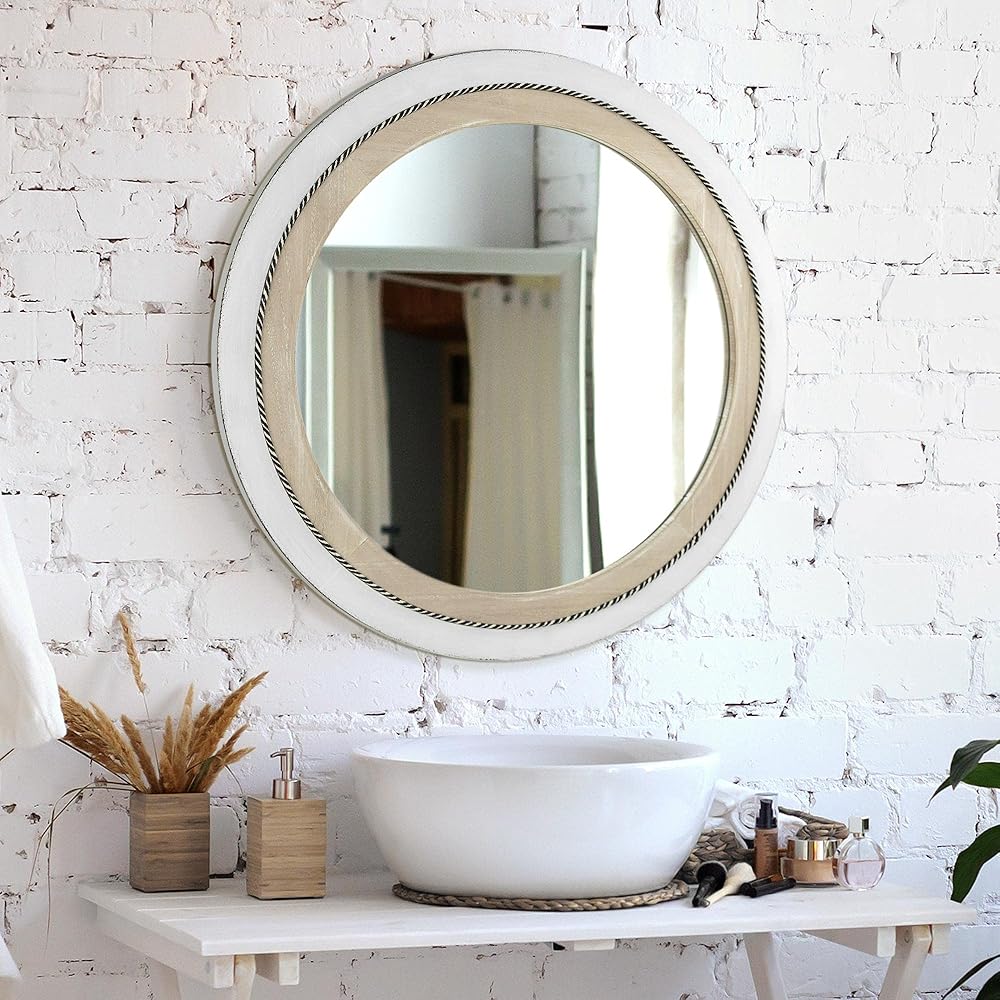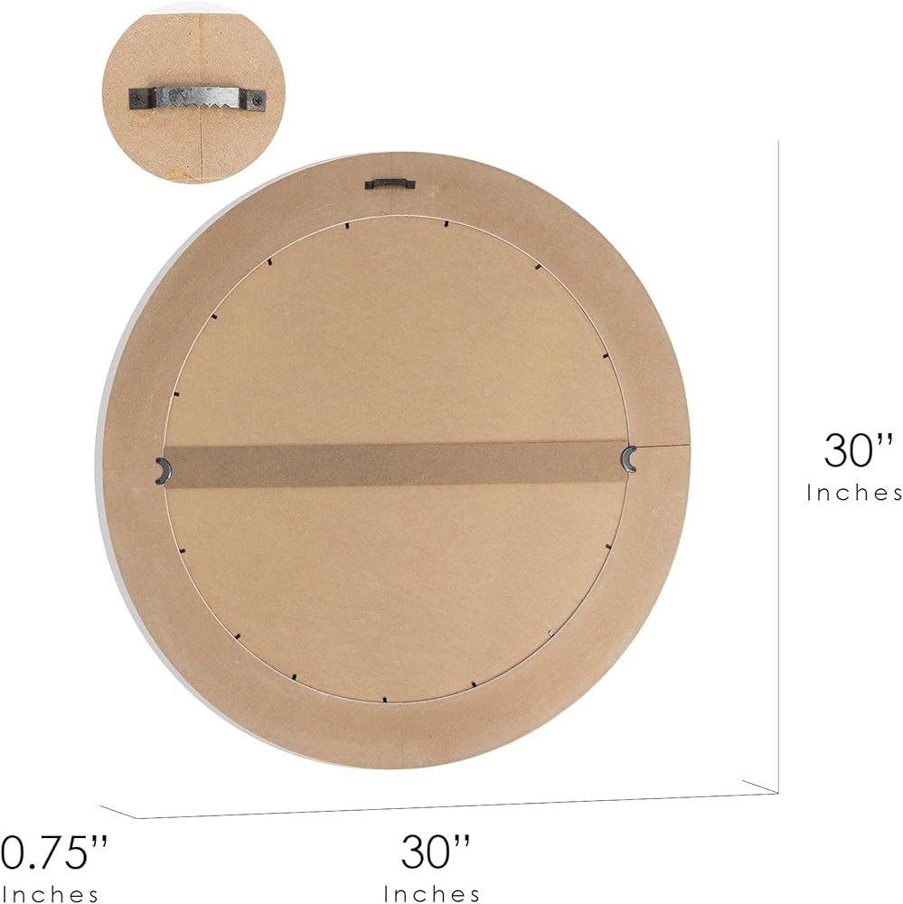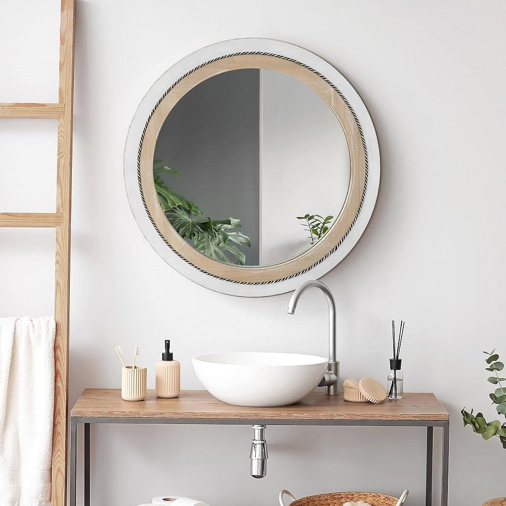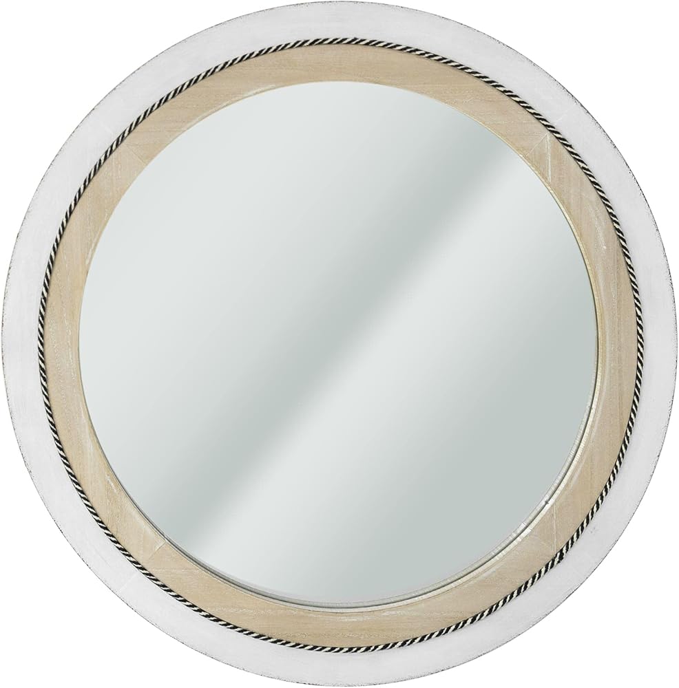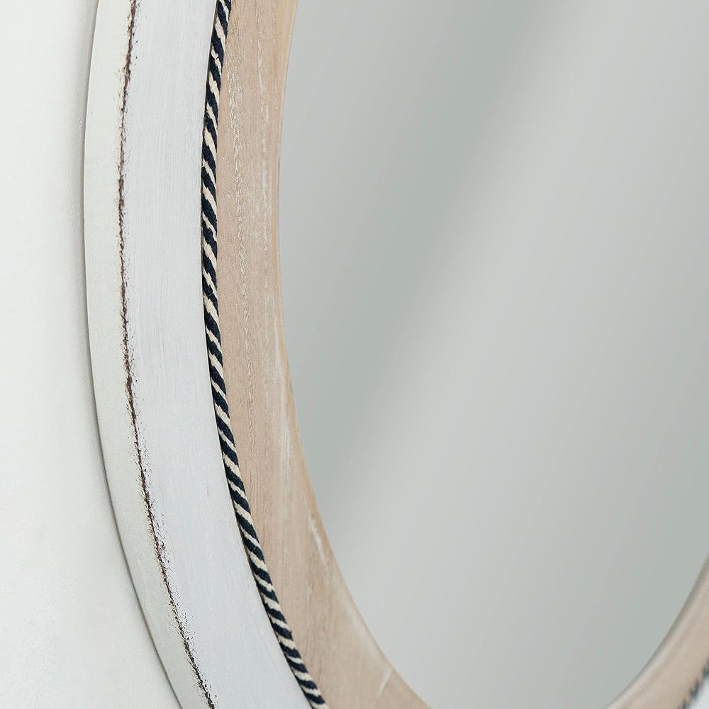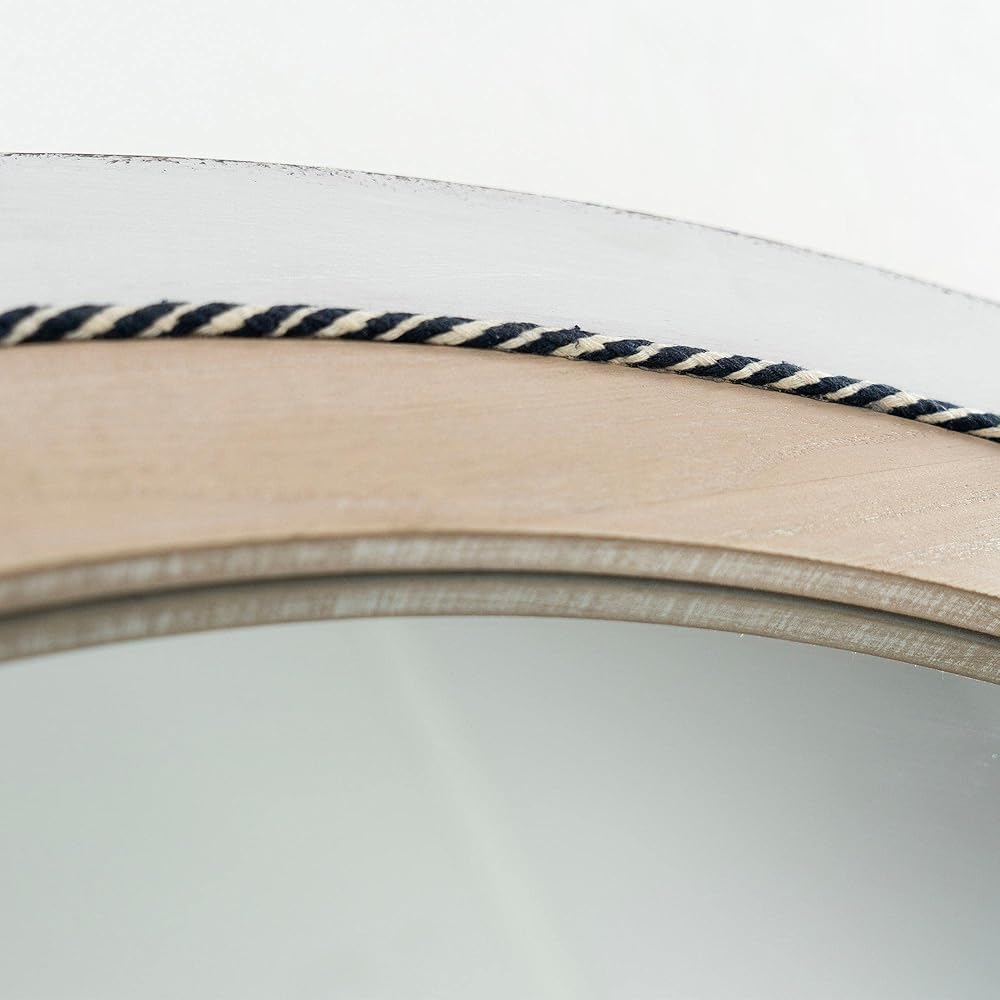 Add sophisticated charm to your space with this reimagined rustic style round mirror. This mirror comes in complementary white and neutral brown shades to suit various home decor styles. A chord of natural jute rope adds subtle texture, while purposely distressed touches on the wood add an antiqued detail. This mirror looks as good in a nautical themed home as it does in a modern farmhouse inspired home. This stunning circular mirror is equipped with a single sawtooth hanger to make hanging a little easier.