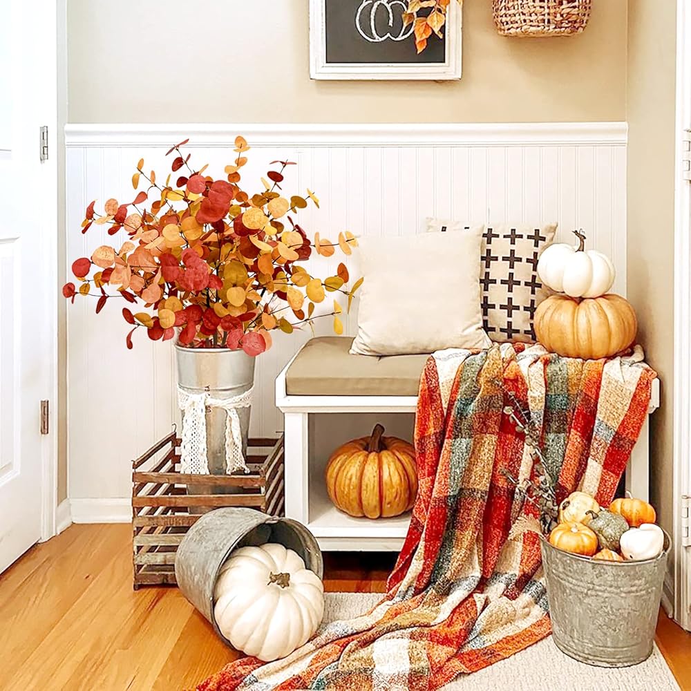 SIZE&QUANLITY&COLOR-- Artificial eucalyptus stems contain 6 pieces. For a more luxurious feel, the leaf is made of velvet. Each Xmas decor is about 28” tall,3 mixed colors (Red, Gold, White) decor your home