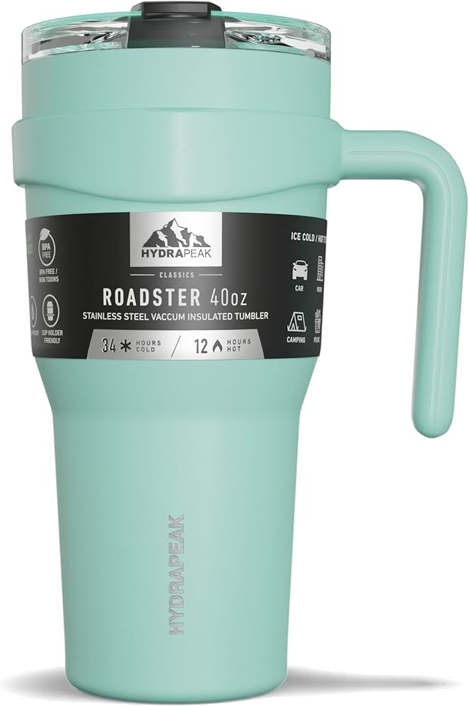 PREMIUM: This Hydrapeak Roadster Insulated Tumbler with Straw and handle is made of high quality 18/8 food grade stainless steel that makes it sturdier, more durable, and ensures the cup remains odor-free. This travel cup with handle was made to take everywhere.