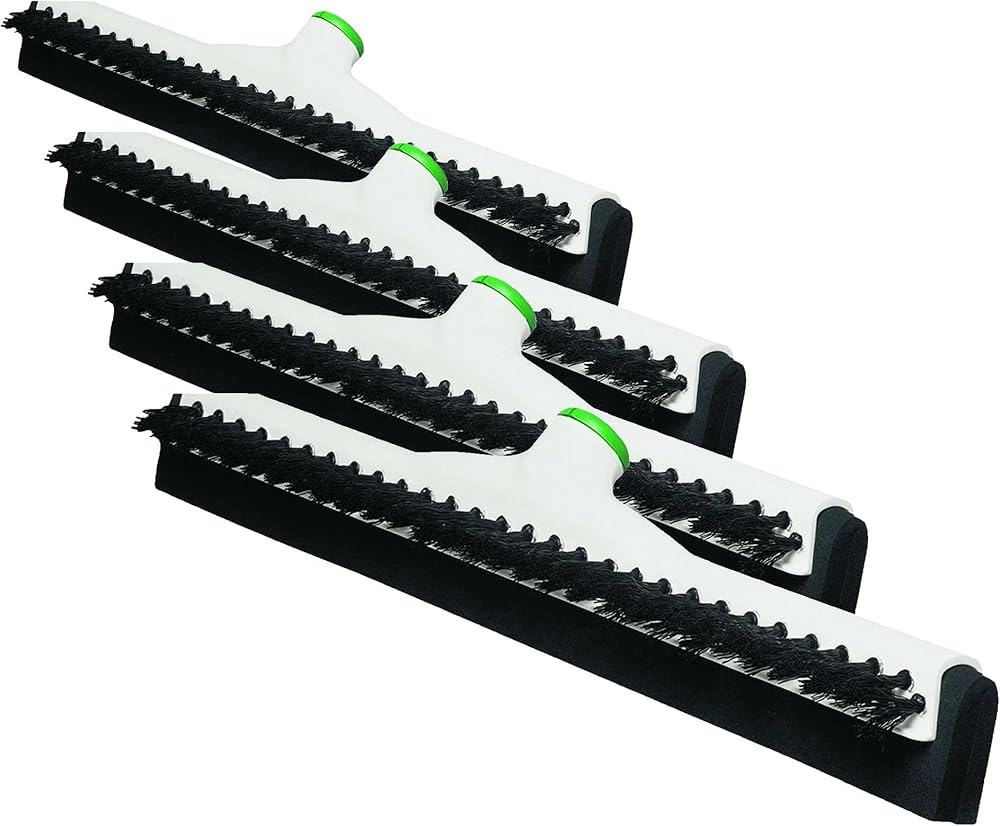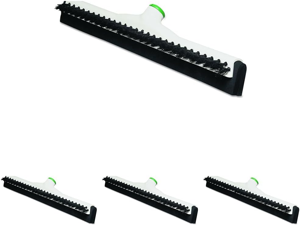 Scrub and squeegee with the combination sanitary brush. Features stiff polypropylene bristles for scrubbing action. Brush loosens dirt in grouted floors while 4" natural black twin foam rubber blade squeegee removes dirt and solution. Splashguard. Durable, threaded socket accepts Acme threaded handles.