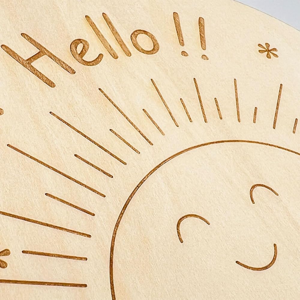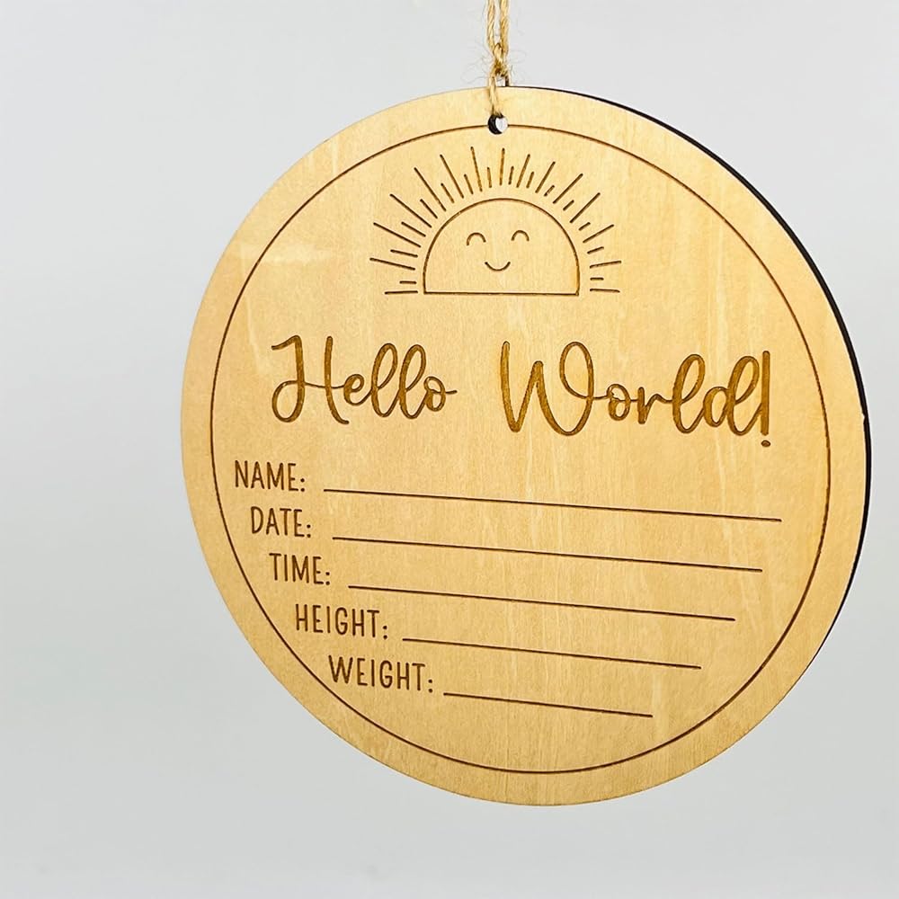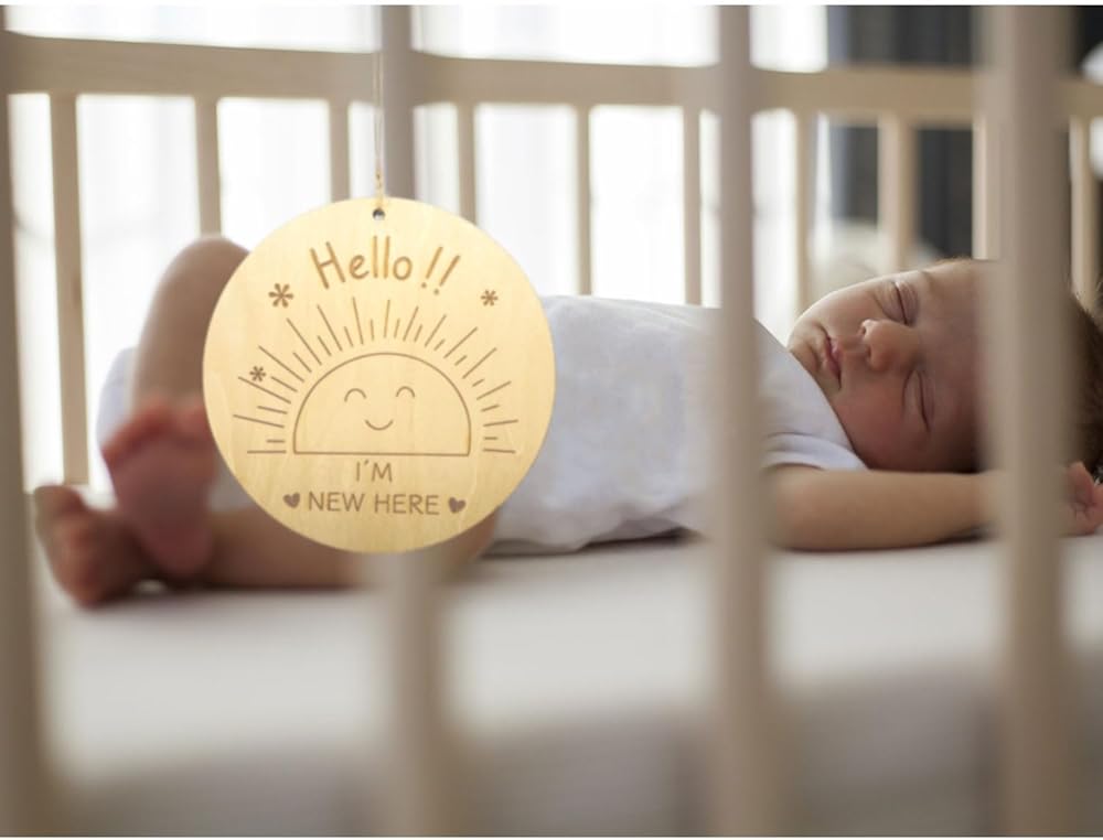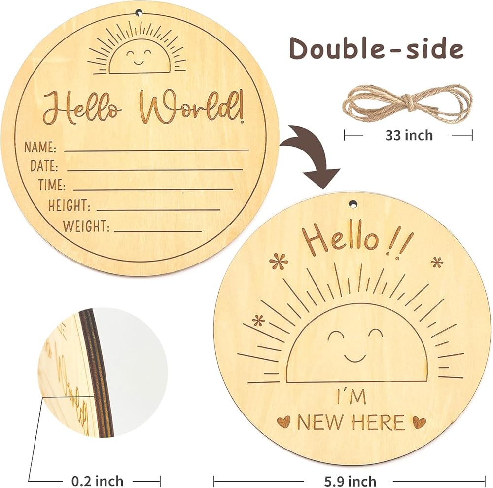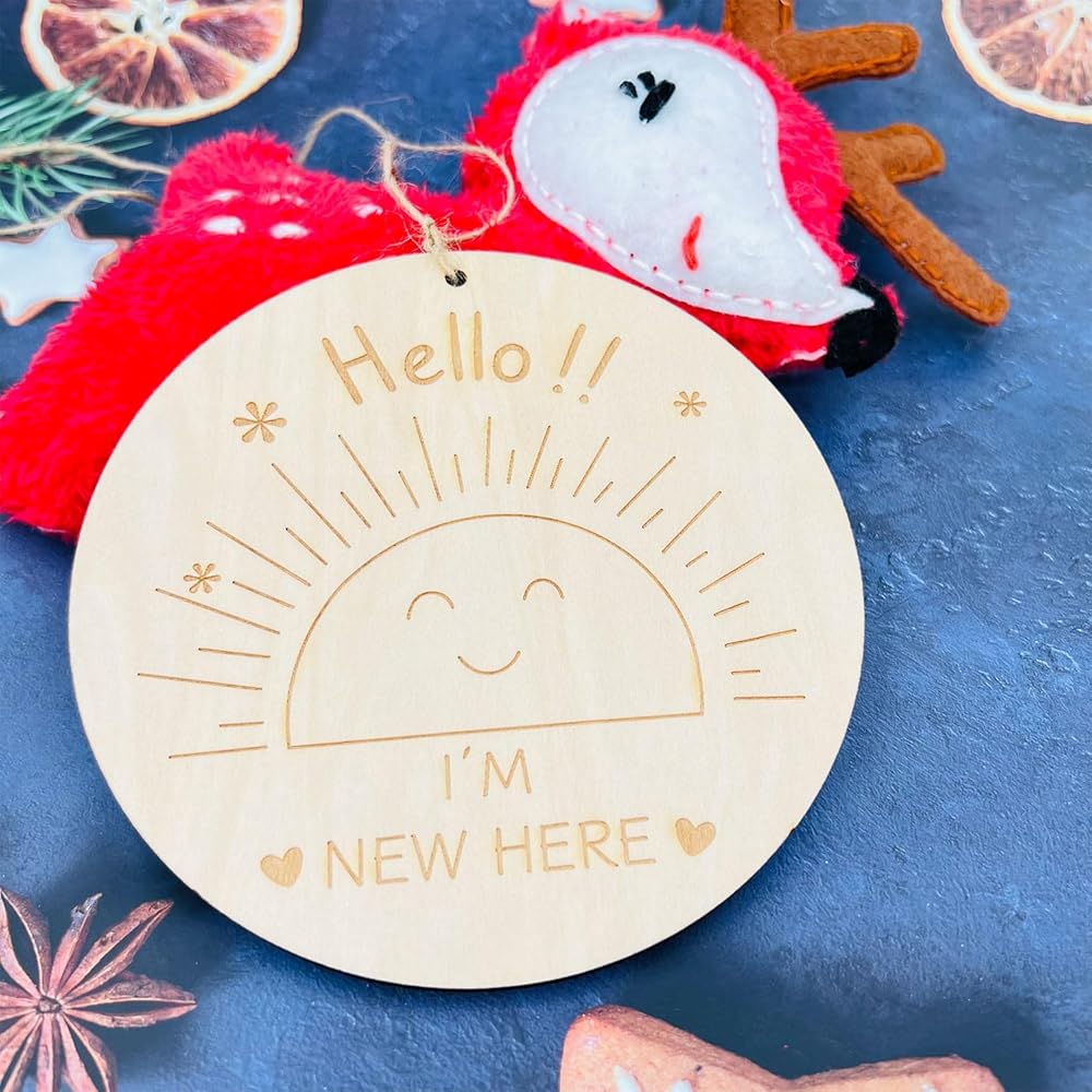 Flip the sign over, and you'll find an endearing engraving that reads "hello!! I'm new here." This reverse side serves as a charming way to announce your baby's arrival.