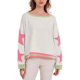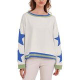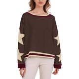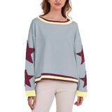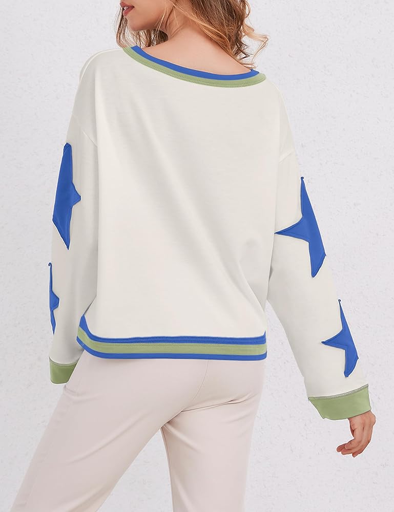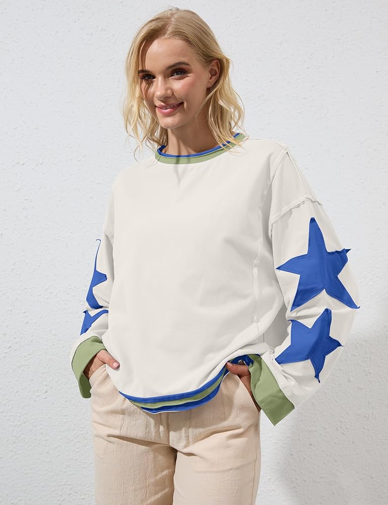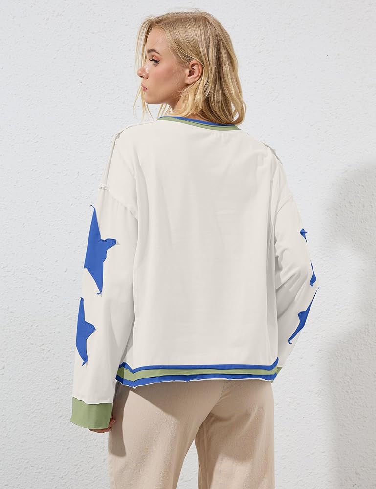 【Design】Eye-catching star graphic design at sleeves, crew neck, raw trim, drop-shoulder, color block layered detail, raised seaming, oversized loose fit. long sleeve pullover sweatshirts, y2k star graphic sweatshirt, women fall outfits, e girl casual clothes, teen girls fall winter clothing.