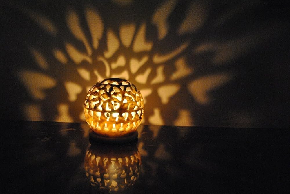 See the magic come alive in the dark when you place a candle in the stone sculpture. The intricately carved patterns get imposed on the surface on which you are holding the sculpture.