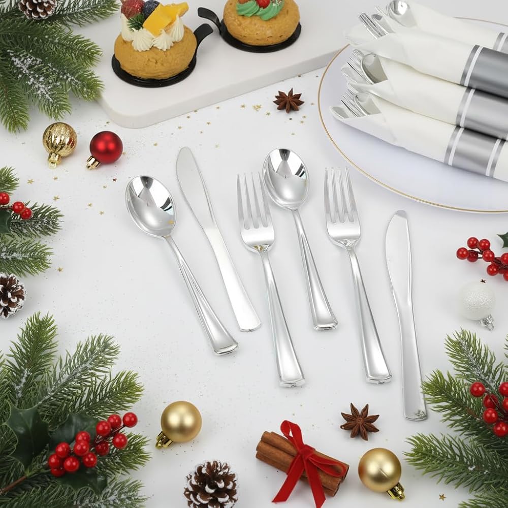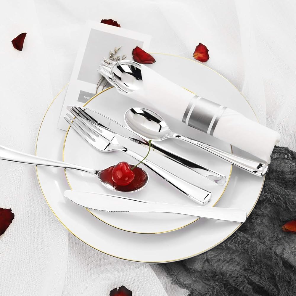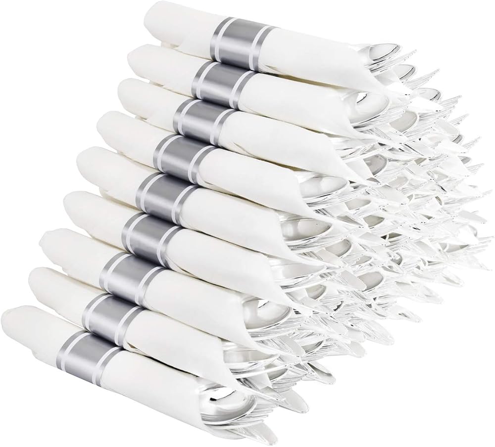 【Strong Durable】This rolled plastic sivlerware is crafted of food grade materials. The gold disposable silverware utensils are not easy to break or bend during use, allowing you and your guests to cut through even tough and dense food with confidence. Pre rolled napkins make it easy to clean the corners of your mouth during and after meals.