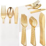 【Value Pack】These gold plastic silverware includes 60 gold plastic forks, 60 gold plastic spoons, and 60 gold plastic knives, 60 black napkins. Whether it's a birthday party or a wedding, the pre rolled silverware is everything you need for a perfect mealtime experience. The gold disposable silverware will totally make your guests happy at the party!
