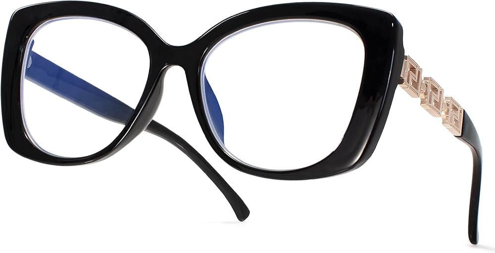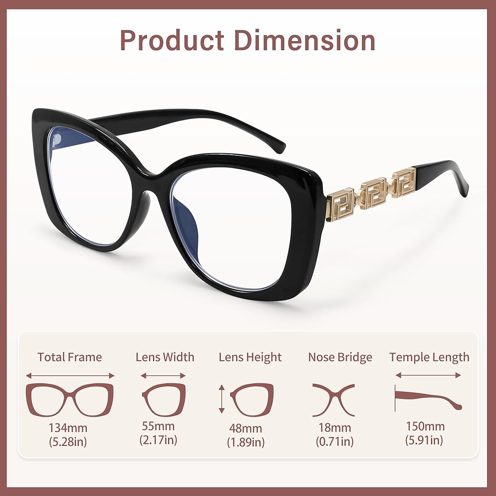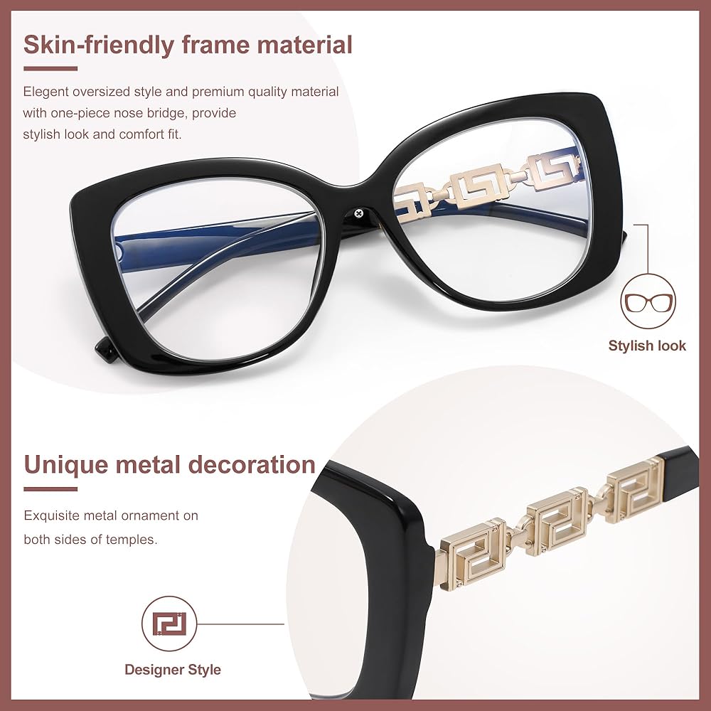 【Premium Quality Frame with Unique Metal Decoration】These oversizing womens anti-blue light blockers are crafted from a high-gloss polished plastic frame with a sturdy metal hinge.The exclusive designer metal ornament on the temples add a touch of luxury and uniqueness to your eyewear. The one-piece nose bridge ensures an excellent wearing experience without any stress, while enhancing your style.