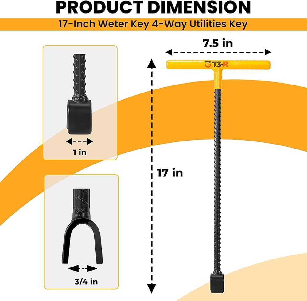 The T3-R Water Meter Key Pack Includes: 1 x 17-inch water meter key and 1 x 4-way multi-functional utility key. Our water shut off tool comes with moneyback guarantee.