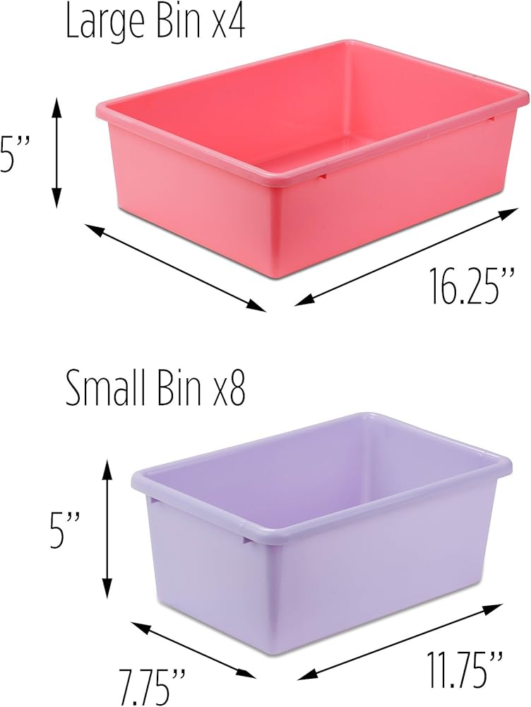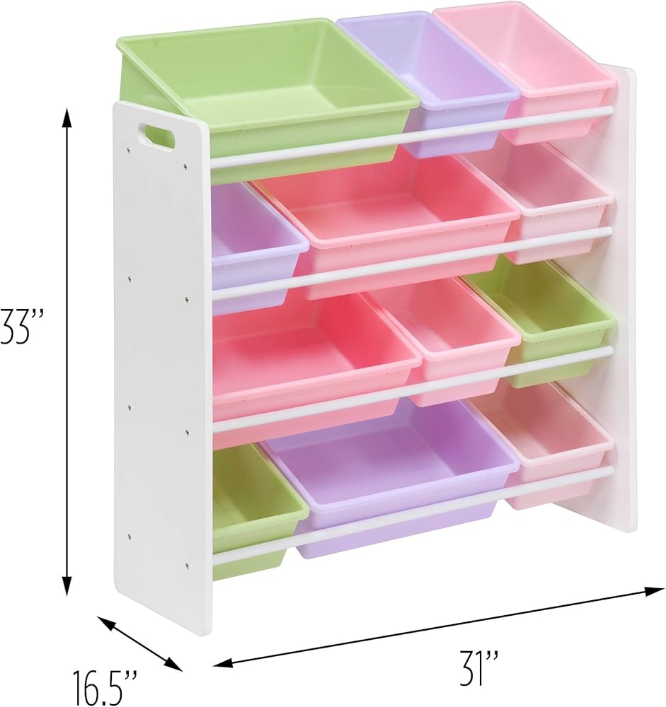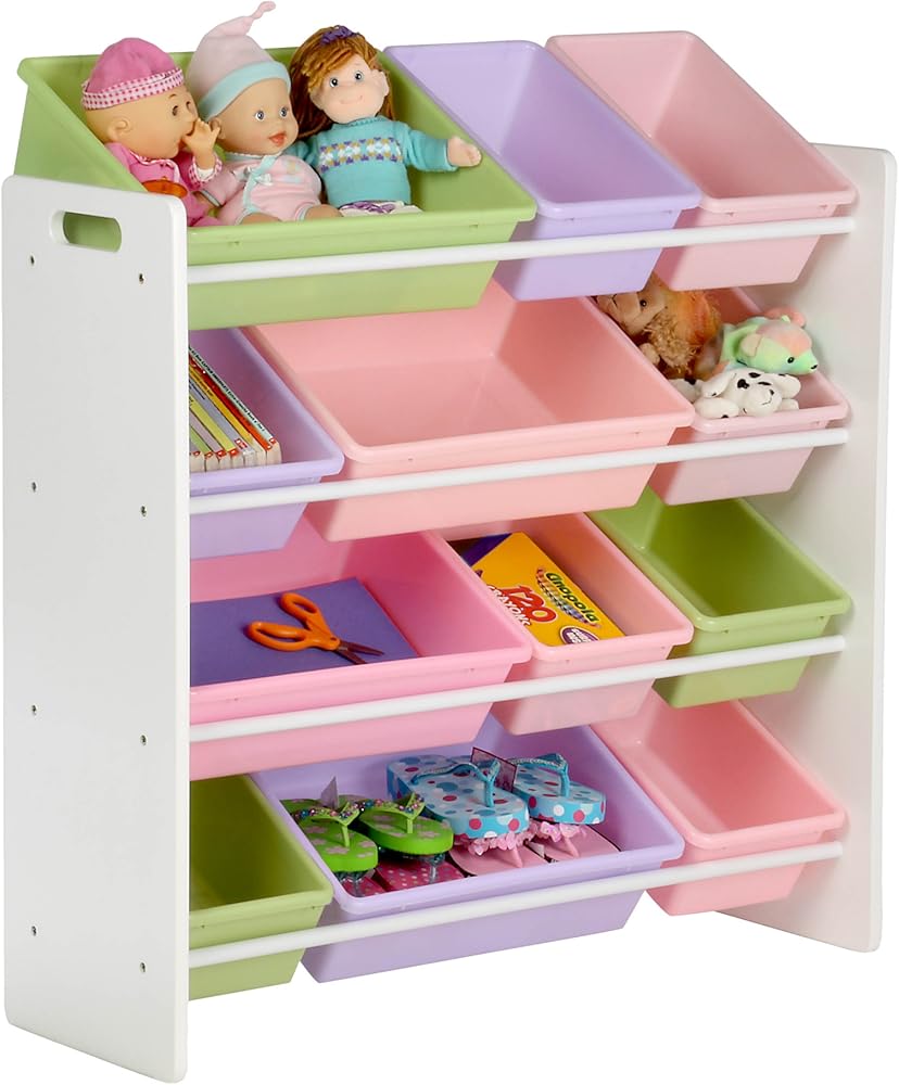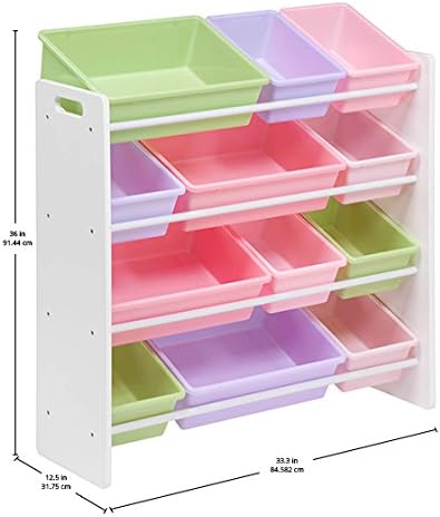 Honey-Can-Do SRT-01602 Kids Storage Organizer, 12-Bins. Removable containers make for quick clean up. Surfaces are durable and stain resistant. Corners are rounded - no sharp edges. Featuring durable strap to secure unit onto wall for safety. Helps develop organization skills. Made of sturdy thick plastic. The perfect organizer for children's playrooms or bedrooms, these colorful bins make organizing fun and easy, even for small kids. Effortlessly sort matchbox cars, tinker toys, action figures, craft supplies and more into the sturdy plastic bins. The natural wood frame holds 12 containers of varying sizes to keep everything tidy. Each bin measures 5 inches high, providing ample storage space for both small and medium size toys, books, clothing, and more. Bins are removable from the shelves making clean-up time fast and simple. Although perfect for kids toy storage, this handy 12-Bin organizer has many other uses. Just use your imagination. (This item is also available in pastel colors). Includes safety mount hardware to secure unit to wall and help avoid tipping.