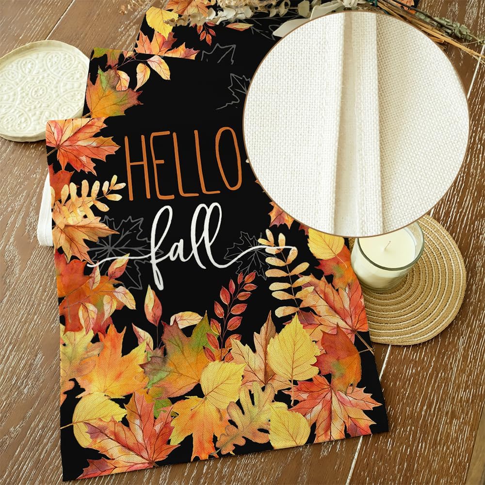 ARKENY Hello Fall Thanksgiving Table Runner 13x48 Inches,Maple Leaves,Seasonal Burlap Black Farmhouse Indoor Outdoor Table Autumn Runner for Home AT445-48