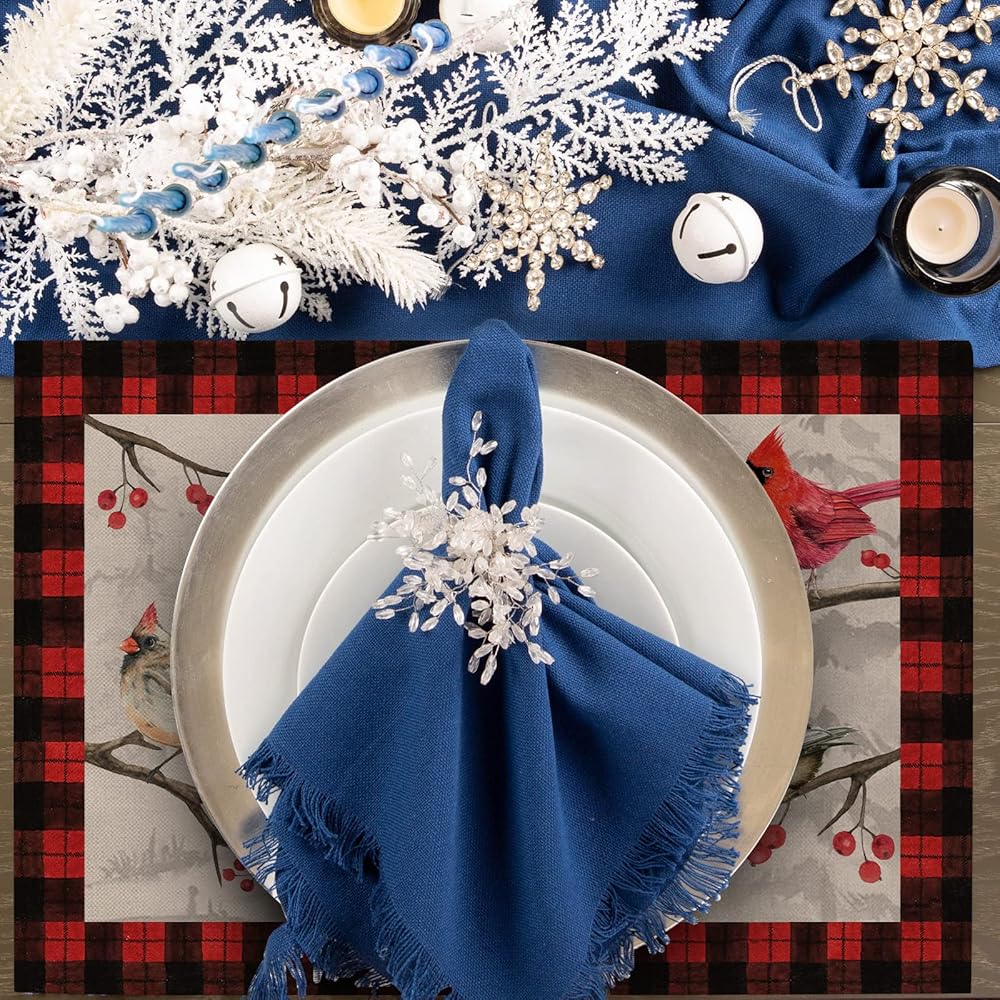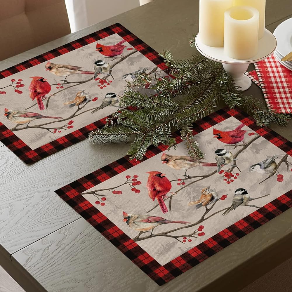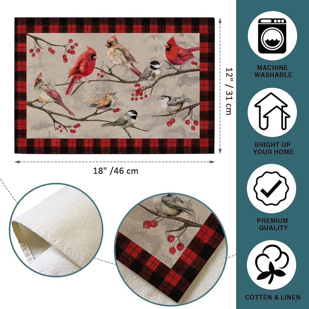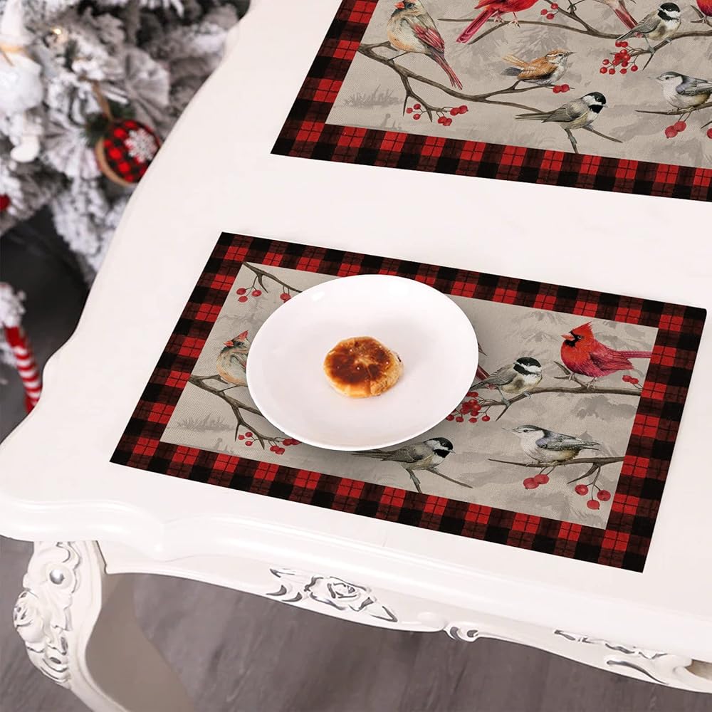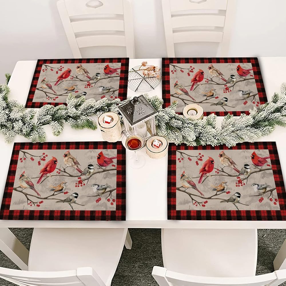 Seliem Vintage Bird Branch Placemats Set of 4, Winter Cardinal Chickadee Berry Tabletop Dining Table Place Mats Home Kitchen Red Buffalo Plaid Decor, Christmas Farmhouse Holiday Party Decoration 12x18