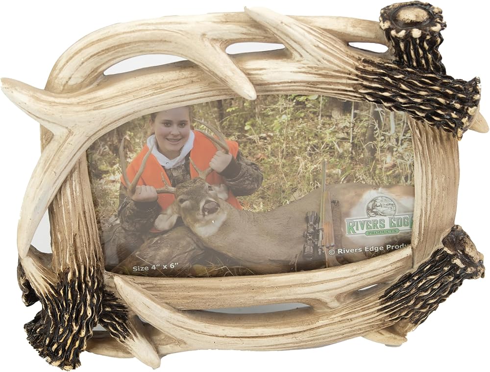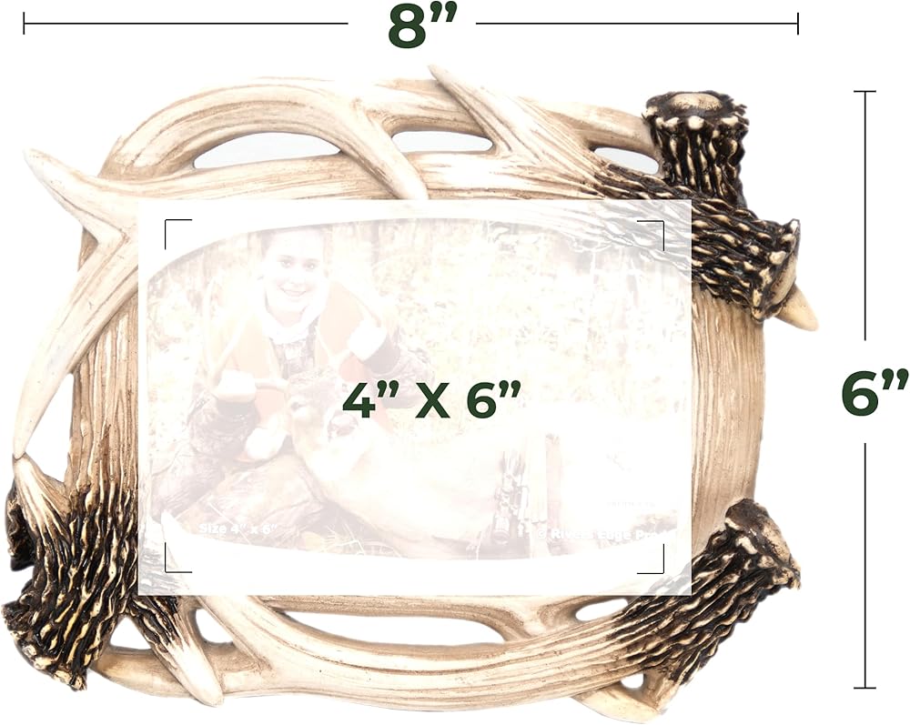 Detailed Design: The rustic 4 x 6 frame has a border constructed of poly resin antlers that accurately resemble real antlers around the edge of the frame