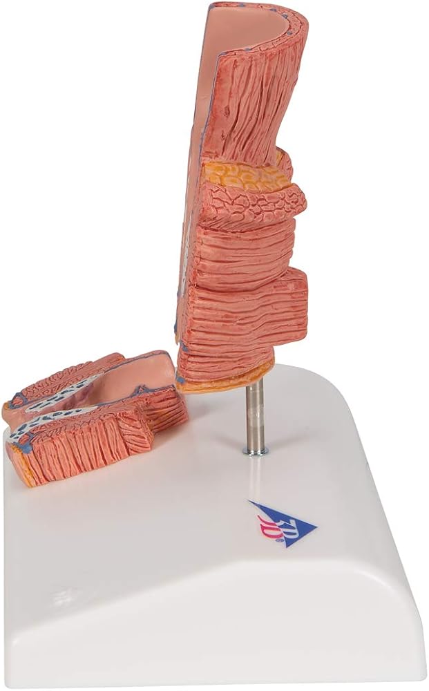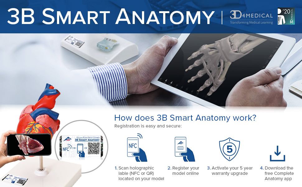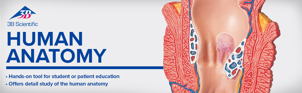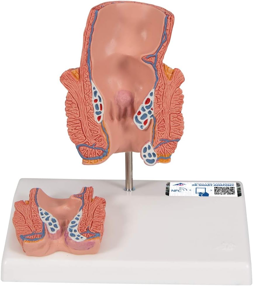 A vivid hemorrhoid model designed to educate patients and students about hemorrhoids. The anatomy model is a life-size frontal section of the as well as a smaller relief on a pedestal. In addition to the anatomical structures of the (sphincter, mucous membrane, venous plexus), the model shows internal hemorrhoids during stage I and II as well as external hemorrhoids. The relief exhibit shows hemorrhoids during stage III and IV. The high quality anatomy hemorrhoid model is mounted on base. NEW and exclusively with original 3B Scientific anatomy models - now enhanced with 3B Smart Anatomy. Your advantages with all 3B Smart Anatomy models: Free warranty extension from 3 to 5 years, free access to 3B Smart Anatomy courses in the award-winning Complete Anatomy app, this includes 11 3B Smart Anatomy courses with 23 lectures and 117 different views of interactive virtual models, plus 39 quizzes. To unlock these benefits, simply scan the label and register your 3B Smart Anatomy model online. All 3B Smart Anatomy features are completely free of charge. "Virtual meets Reality" developed by 3B Scientific makes learning human anatomy even more effective across all media.