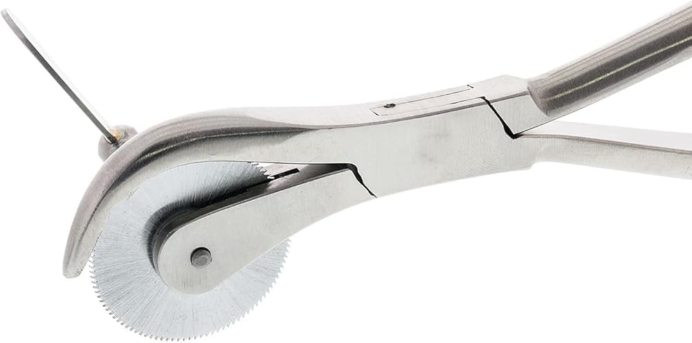 Large ring-cutting pliers. Easier to use than traditional ring-cutting pliers. Made entirely of stainless steel, the handles are gently curved. The turning handle is large and the blade is a generous 1-3/16" (30.30mm) in diameter for easy cutting. Blades are made of tempered steel and are easily replaced. Length: 6-1/2" (170mm). Supplied with one spare blade.