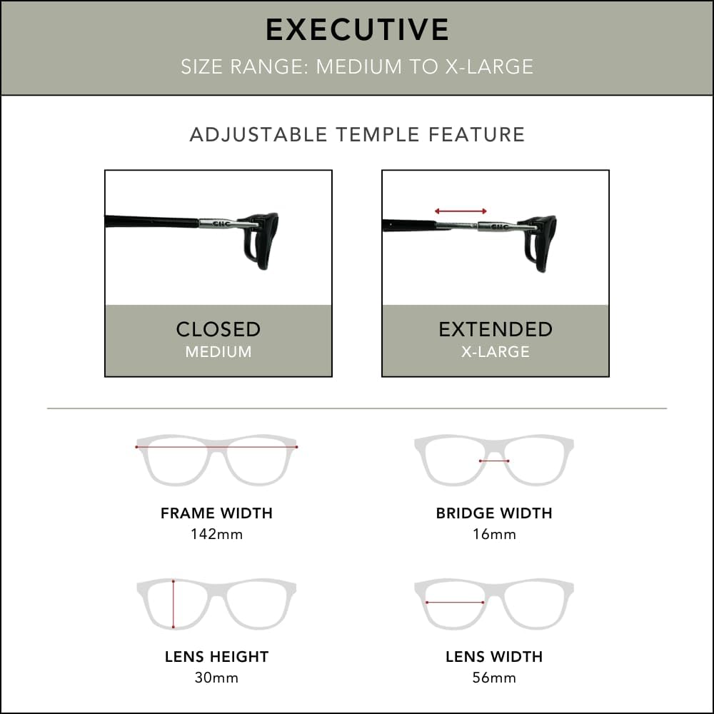 • SIZE RANGE: Medium to X-Large (M-XL). All CliC glasses have temples that can be adjusted to fit a range of sizes. See our size chart for specific measurements.