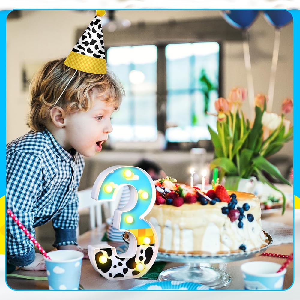 Toy Inspired Birthday Party Supplies LED Light up Number Cartoon Party Decoration Cow Print Blue Sky White Cloud Marquee Glowing Number Sign for Kids 3rd Birthday Party (Number 3)