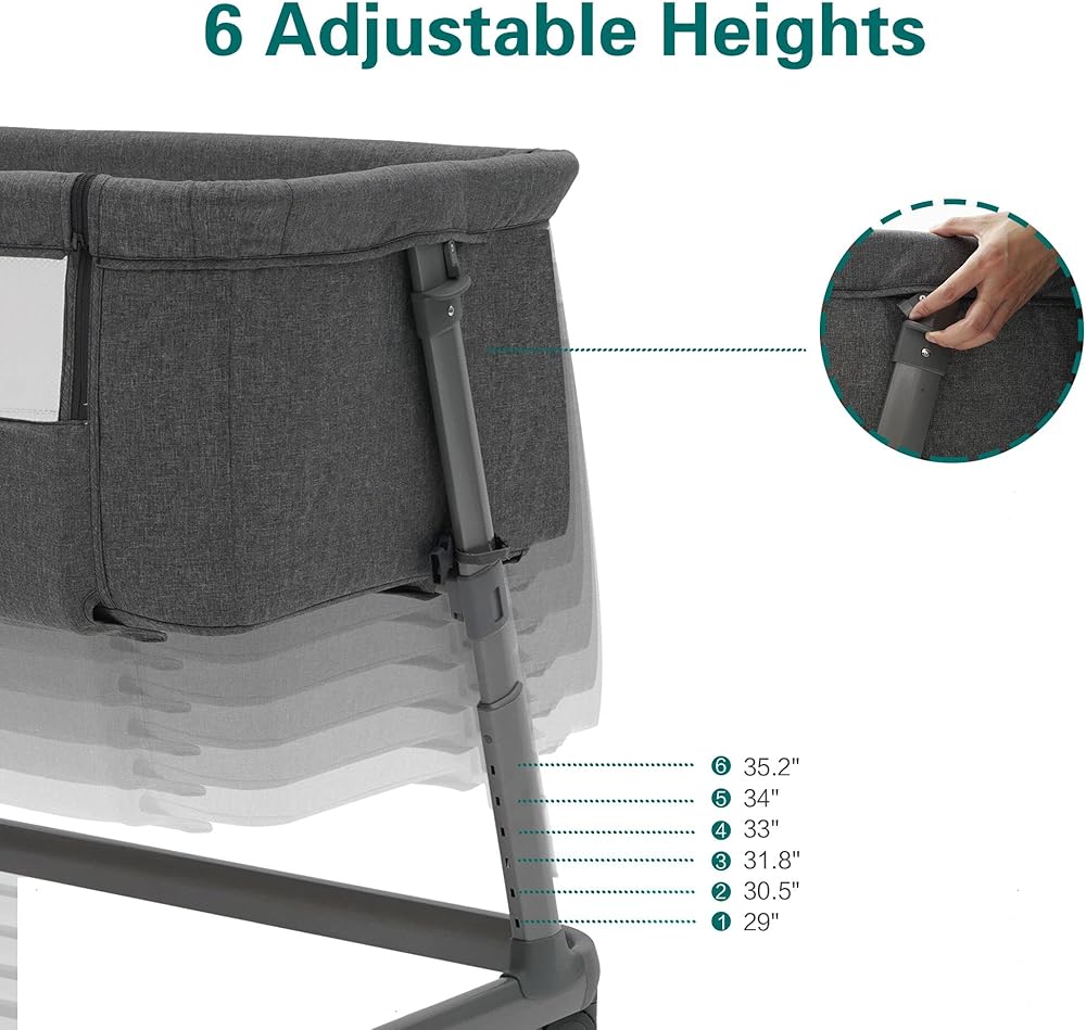 【6 Height Adjustable】- Adjustable to heights of 29"-35.2", our baby bedside sleeper is ideal for accommodate more use scenarios. Air mesh on both sides are well ventilated while allowing you to keep a close eye on your baby.