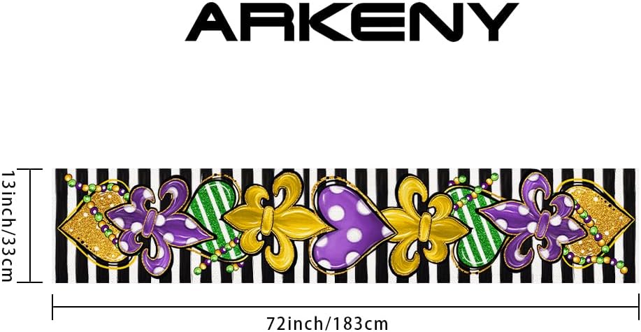 Introducing our Mardi Gras table runner, a must-have for your festive celebrations! Measuring 13 x 72 inches, this generous-sized table runner offers versatile decor options. Whether adorning your dining table or creating a stunning centerpiece, it effortlessly elevates your Mardi Gras ambiance. Not limited to traditional use, our table runner provides versatile styling options. Use it as an eye-catching centerpiece, adding a festive touch to your home decor. Enjoy the convenience of effortless care and maintenance with our easy-to-clean table runner. Designed to withstand everyday use, it is machine washable, ensuring its vibrant colors stay intact. But it's not just about style; our table runner also offers enhanced table protection. It acts as a practical barrier against spills and stains, keeping your table safe. Note that for heat protection, a heat-proof mat should be placed on top of the runner. At ARKENY, we offer a wide range of Mardi Gras decor and accessories. Explore our collection to find the perfect pieces that complement your table runner and placemats. Create a complete and cohesive look for your celebration, delighting in the abundance of choices.