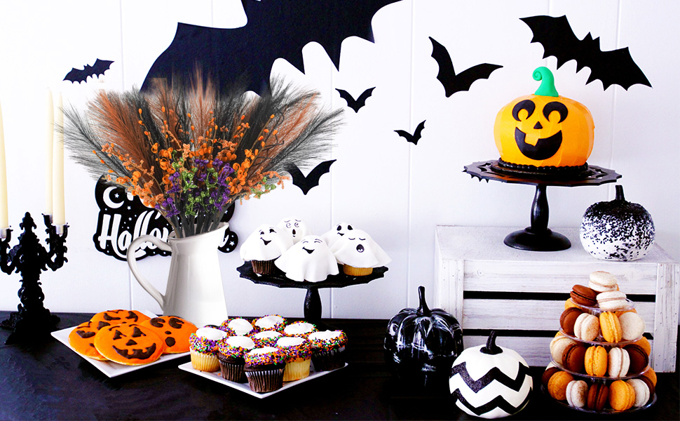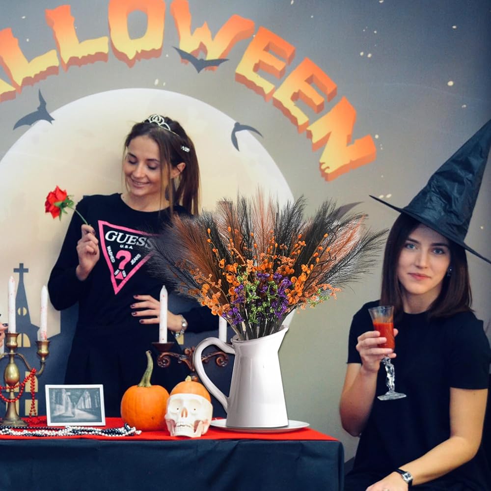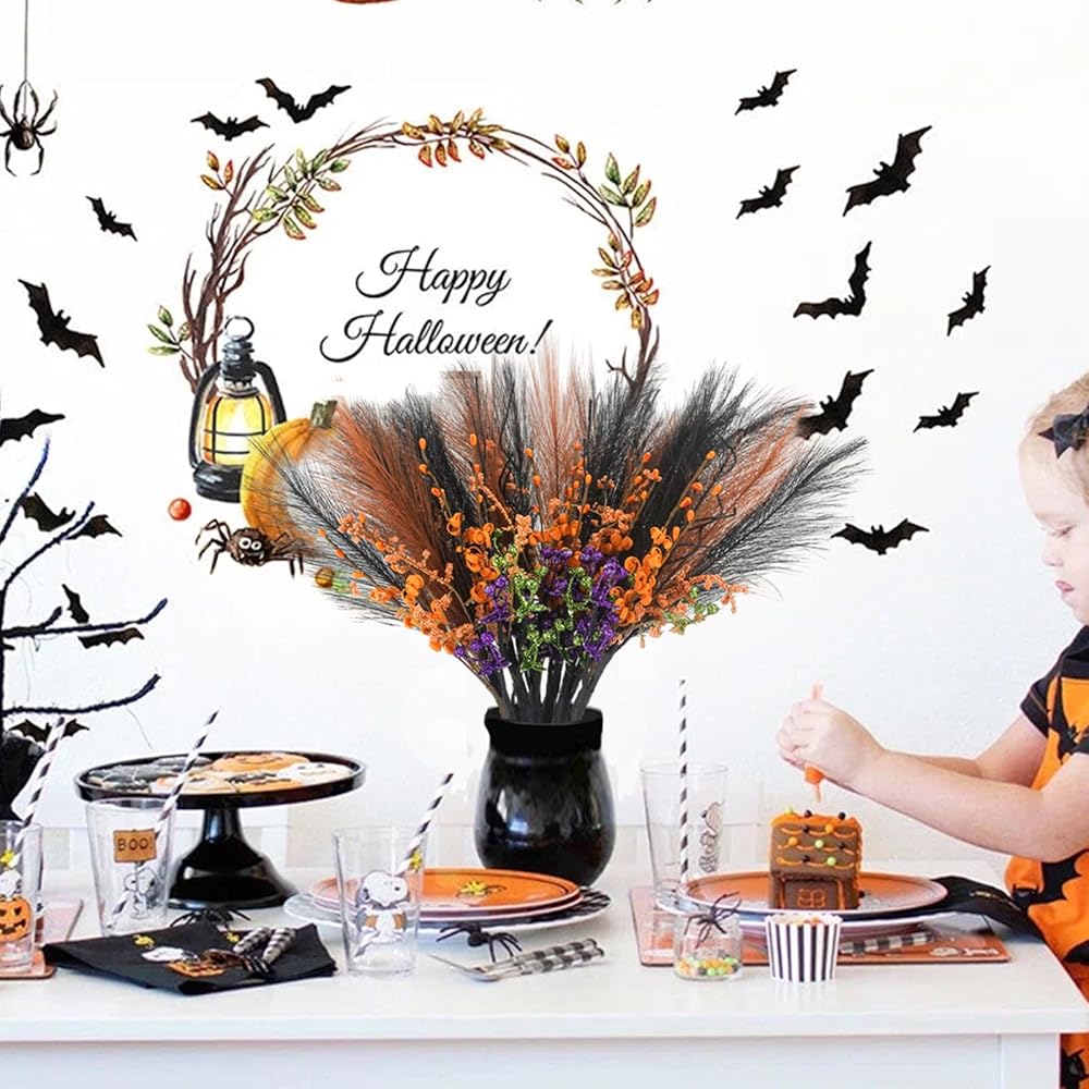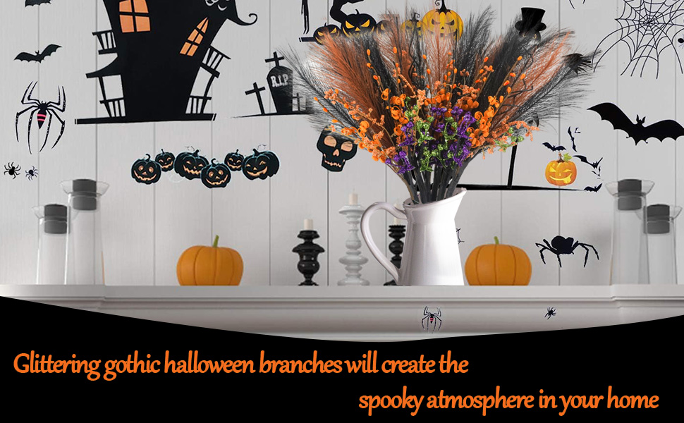 Realistic Looking: These pampas grass stems choose Halloween as the theme, combine black and oragne pampas grass, berries, fall flowers, as well as glitter powder together, look vivid and realistic, shiny and eye catching, will create a spooky atmosphere for your Halloween party