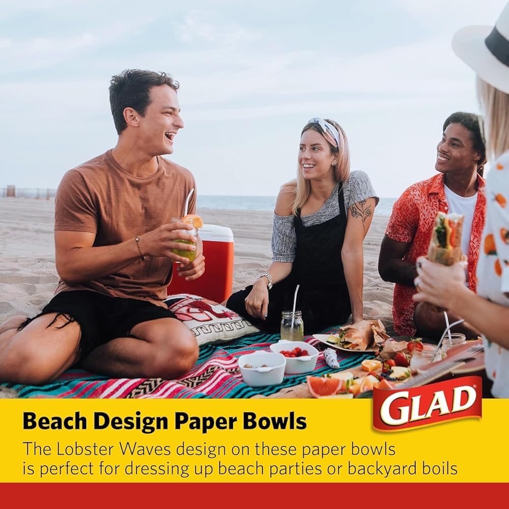 This fun summertime design features lobsters and ocean waves - ready to dress up your next beach picnic. Whether you're dressing up daily dinners, serving up a fun snack time, or planning the perfect party, we believe in bringing a little magic to every mealtime. Glad Everyday paper bowls make mealtime easy. Made from the highest quality materials to be microwave safe and cut resistant, these beautiful paper bowls will instantly dress up any dinner, dessert, snack, or meal at your table setting. These paper bowls are disposable, making cleanup easy for everyone. You can feel good about the tabletop you use when you dine with Glad. Glad brings you 12oz microwave safe disposable paper bowls, helping to make every meal or snack even more enjoyable. This is a package of 50 paper bowlsin a cute Lobster Waves design. Each of these disposable paper bowls in this 50-count package is made to be cut resistant to stand up to slicing knives and poking forks. Microwavable paper bowls like these can be safely used in the microwave to reheat your favorite meals so you can enjoy them again and again. Great for the young and young-at-heart: adults, kids, and toddlers. These disposable paper bowls work well for everyone and every occasion. They feature a beachy design that will add color and fun to every picnic, summer day, or crawfish and crab boil! Sure to add colorful design flair to any table setting. Dine better with Glad. YOUR SATISFACTION IS OUR PRIORITY: If you have any questions or feedback, please reach out to us at Brand Buzz CP.