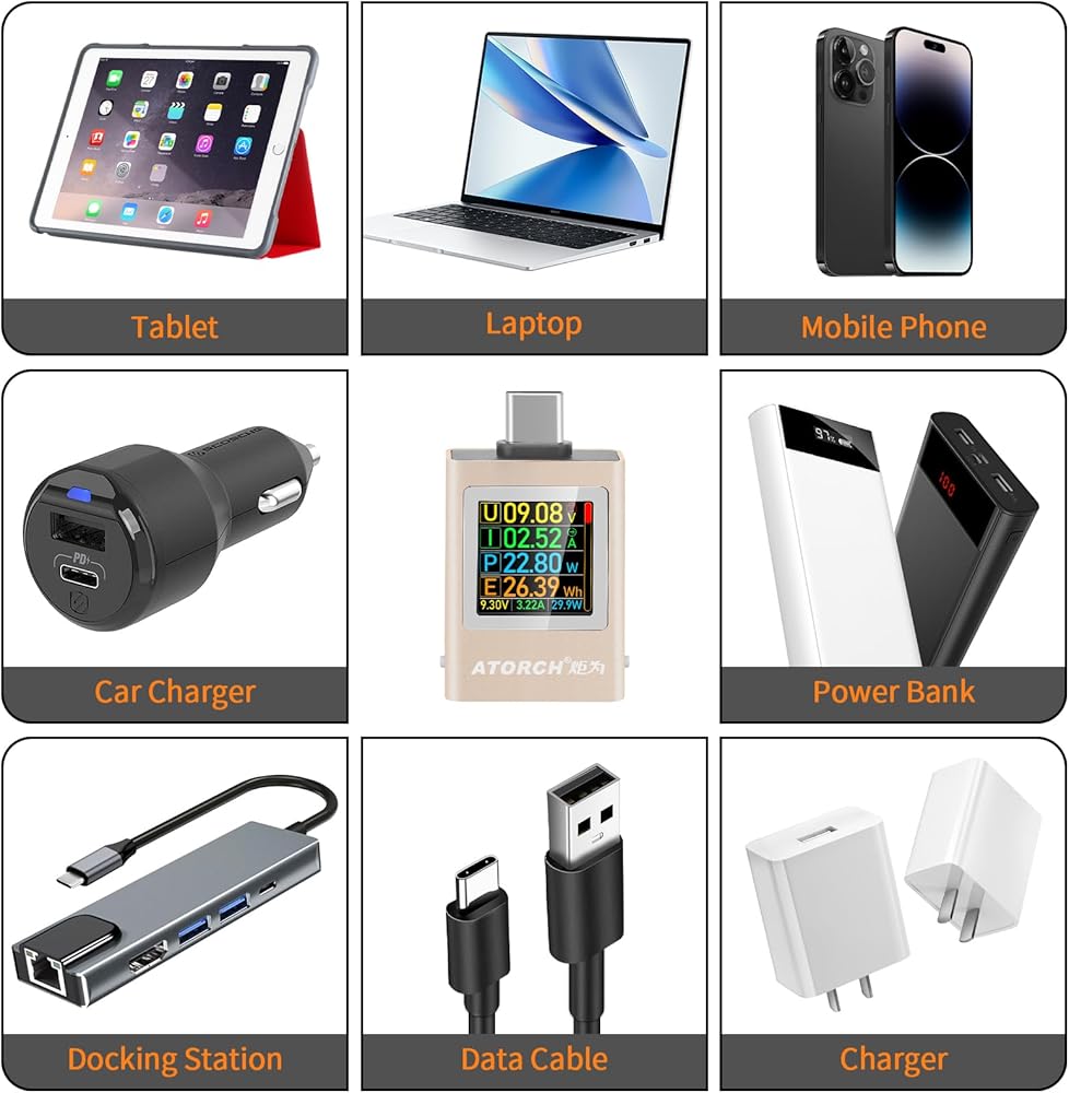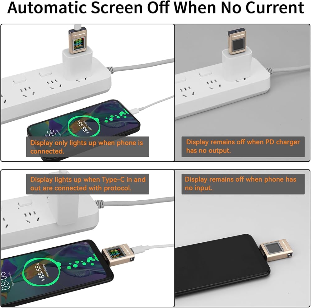 【Auto Screen Off and Wide Compatibility】This USB C watt meter can automatically turn off the screen when there is no current, which can save power and extend the service life. It is compatible with various devices with Type-C port, such as laptops, tablets, phones, power banks, chargers, etc. It is a must-have tool for testing and monitoring your devices.