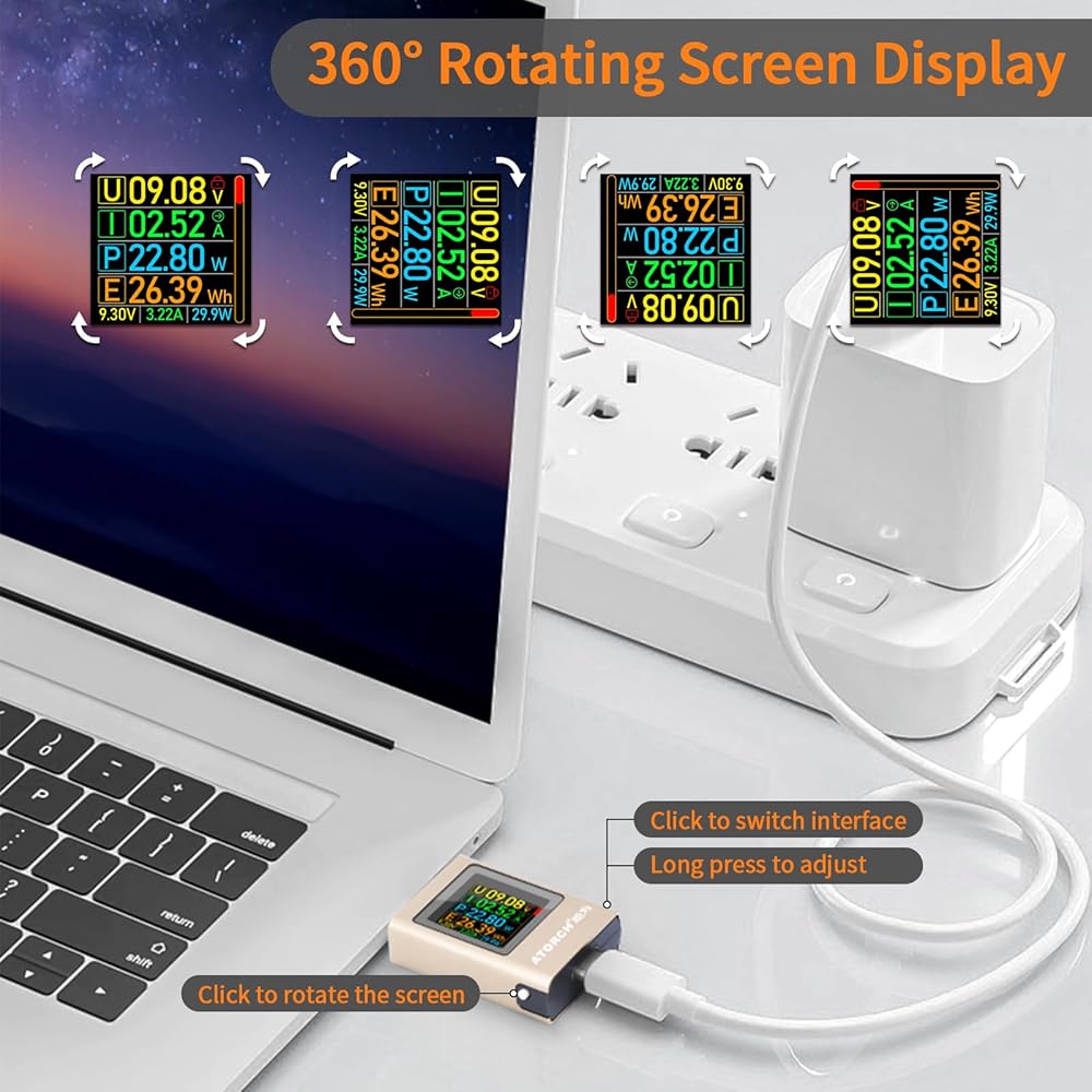 【5 Display Modes and 360 Degrees Rotation】This USB C meter has a high-definition screen, which can display 5 interfaces. You can switch modes with the button. The screen can also rotate 360°, which is convenient for viewing from different angles.